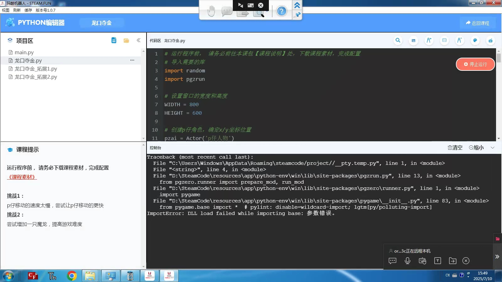 File "D:\SteamCode\resources\app\python-env\win\lib\site-packages\pgzrun.py", line 13, in <module>