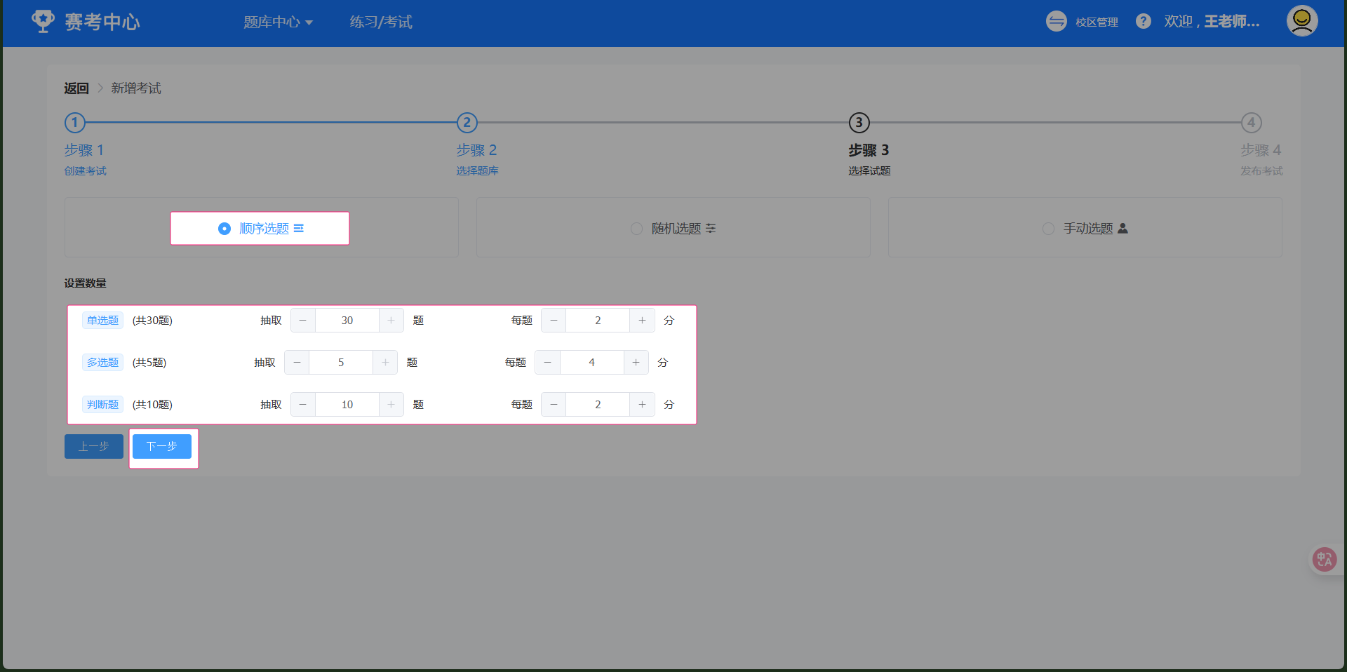 可以单独设置单选题、判断题、综合题的分数。然后点下一步