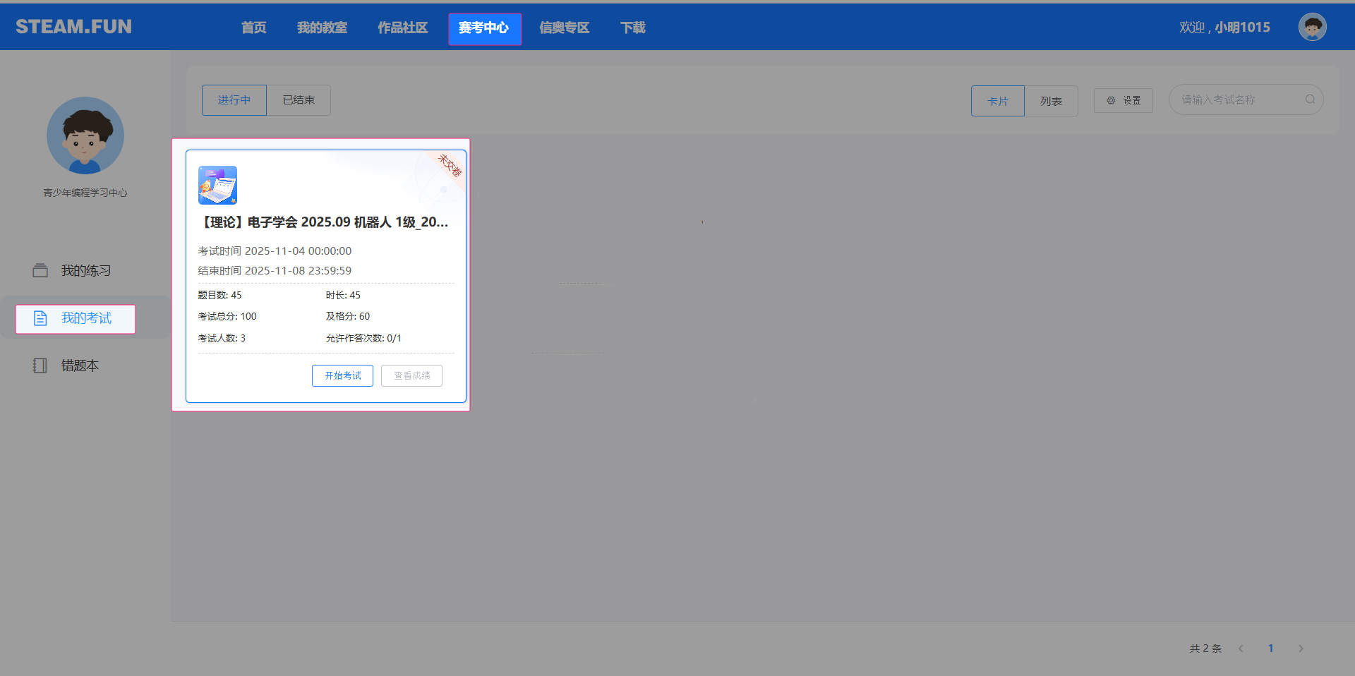进入赛考中心-找到我的考试-找到对应的考试可以进入参加考试