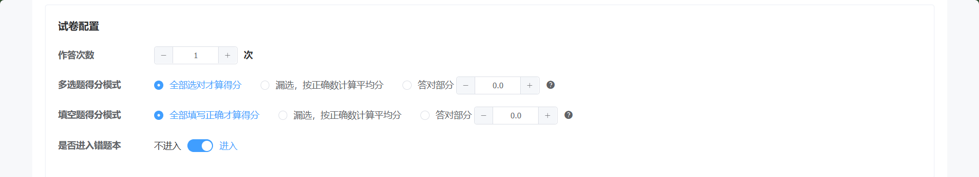 设置作答次数、多选题的得分模式、填空题的得分模式、是否进入错本。