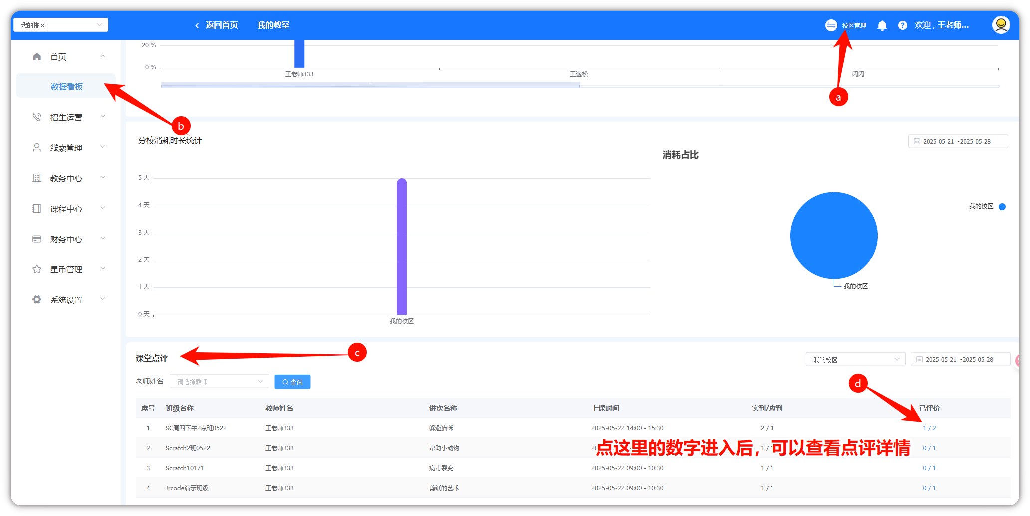 答:可以的,登录超管账号后,进入校区管理,然后点左侧的数据看板,向下滑动,可以看到老师的点评记录。