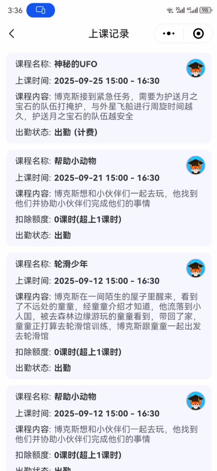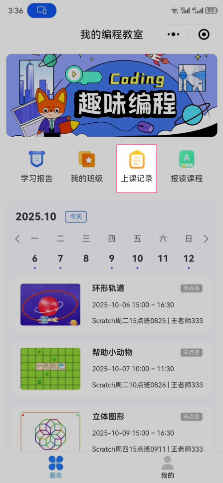 ),可以通过小程序"编程教室家长端"进行查看学生的上课记录等操作。
