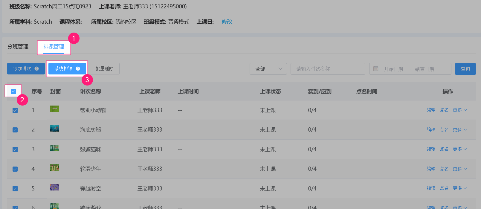 步骤4:在班级的排课管理内,选中要上的课程,按教学计划做排课操作