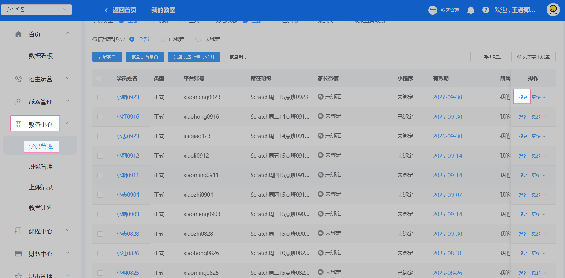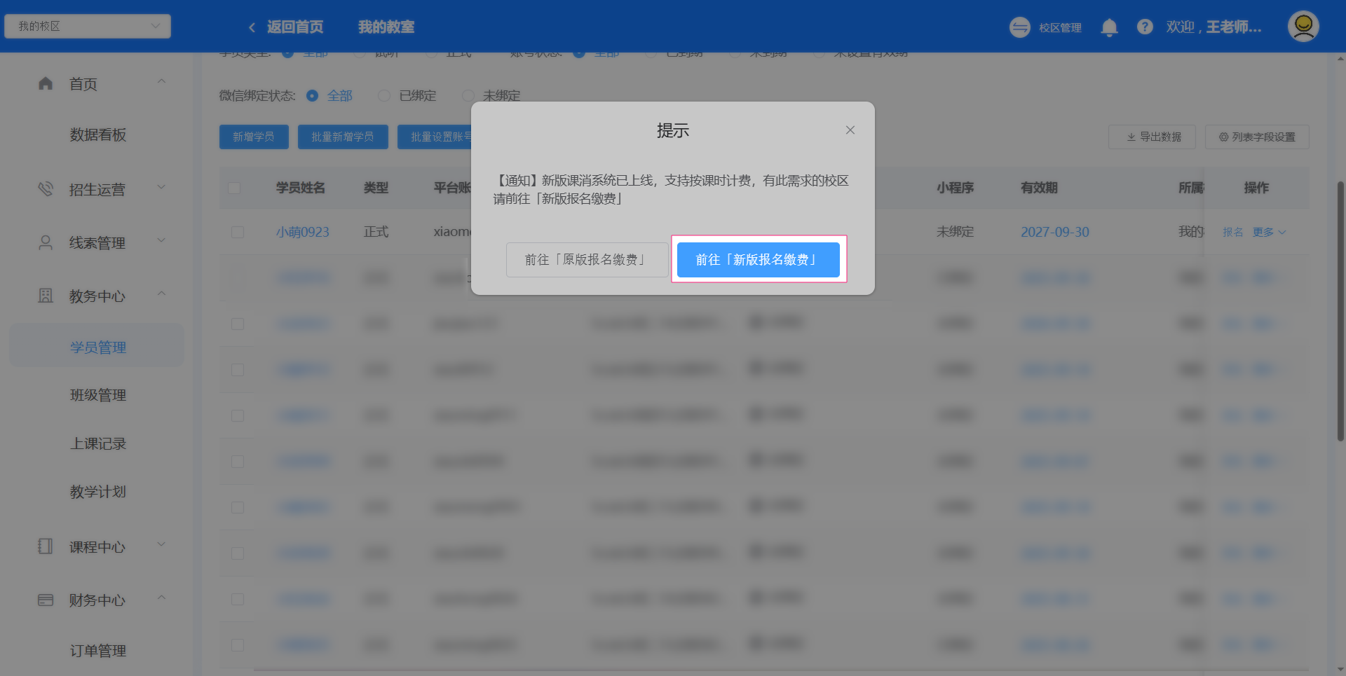 路径1:教务中心、学员管理、找到学生后,点击学生后边的报课按钮,进入新版报名缴费。
