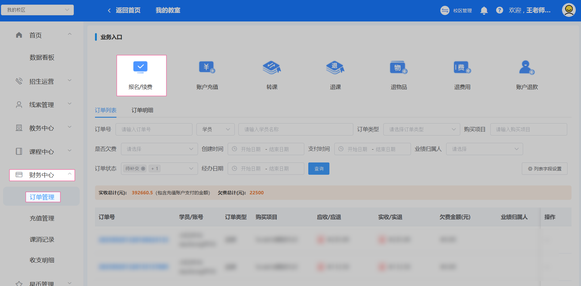 路径2:财务中心,订单管理,点击报名/续费按钮。然后输入学员名字或直接下拉选择。