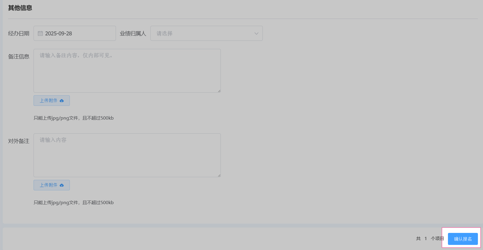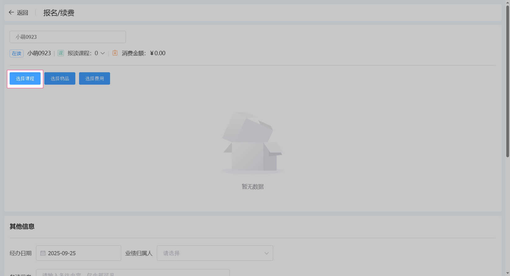 系统自动记录经办日期,校区也可以录入备注信息,及指定业绩归属人。