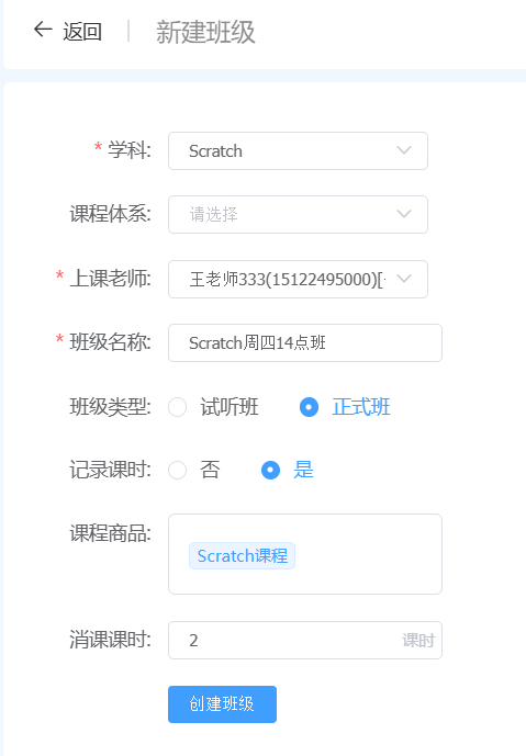 步骤2:选择学科科目,安排上课老师,设置班级名称,关联课程商品,点创建班级按钮。