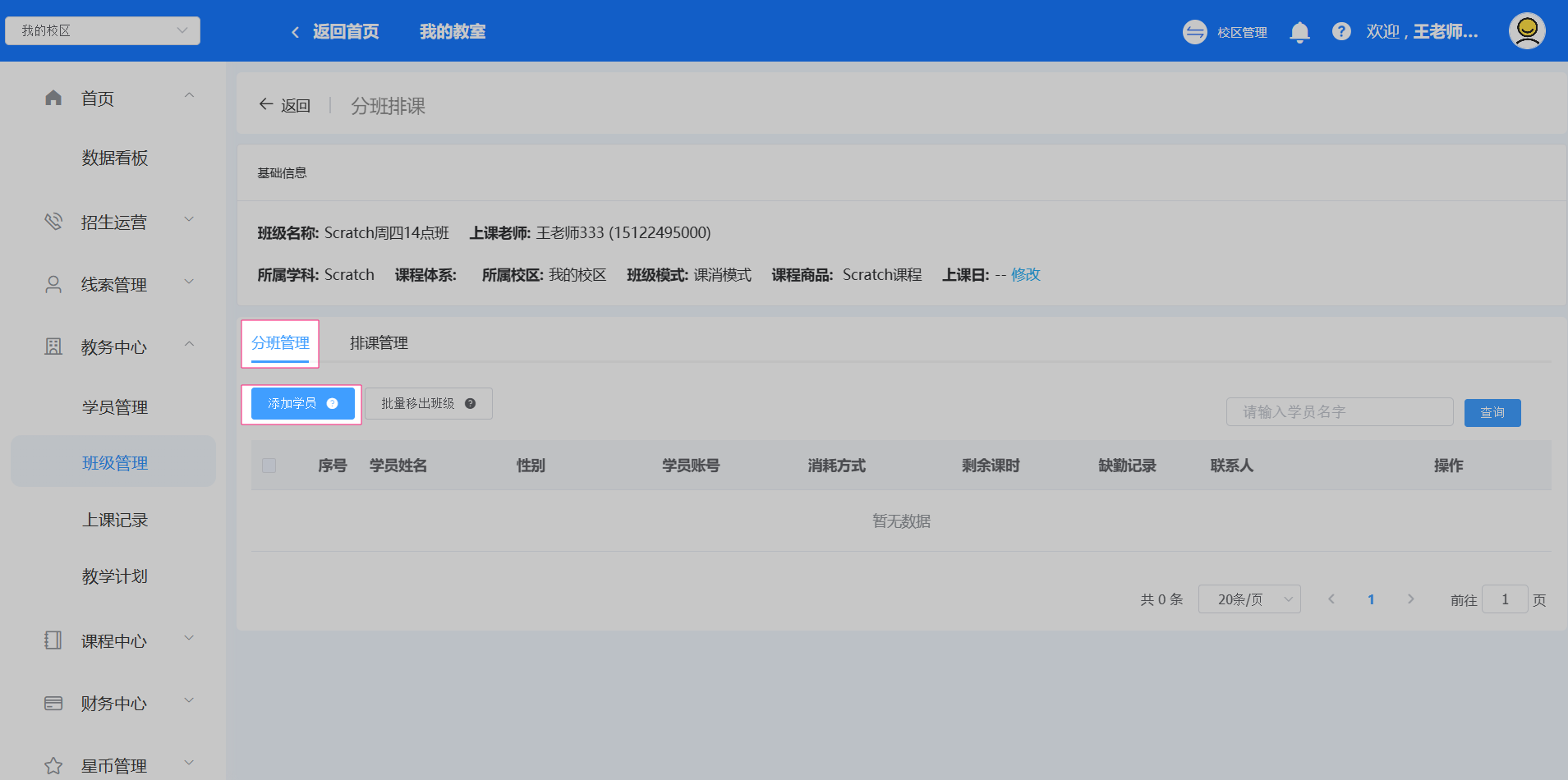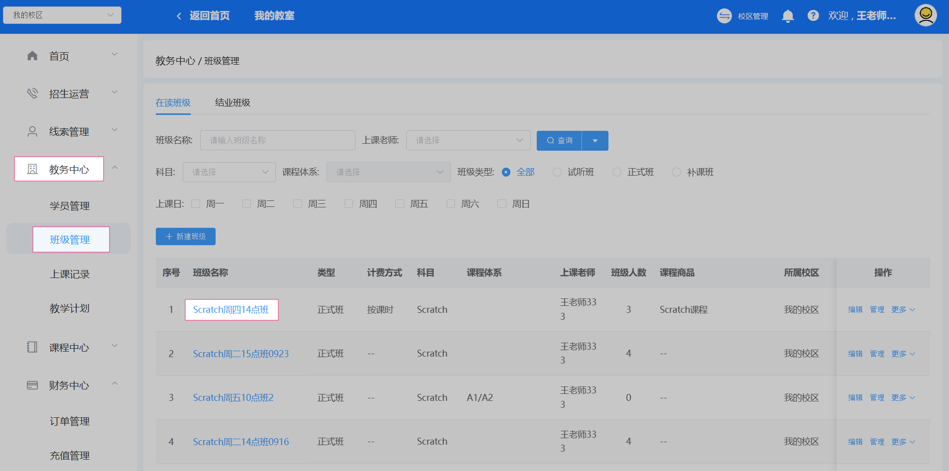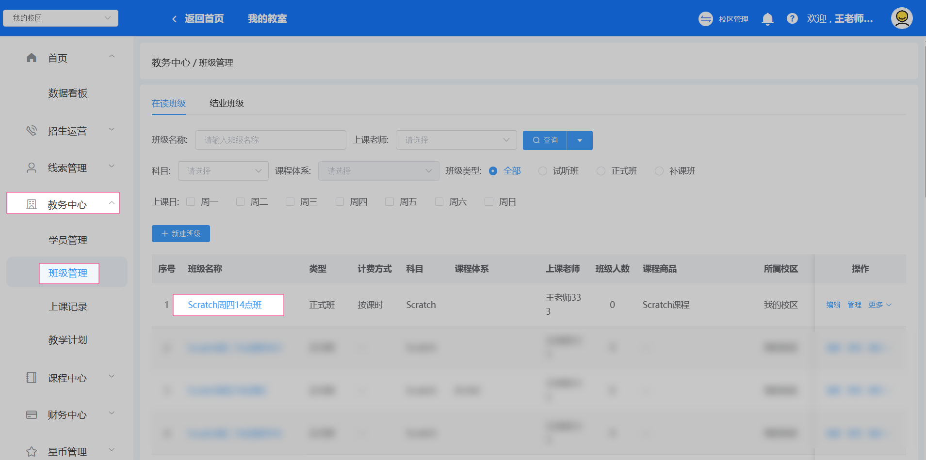 步骤1:进入教务中心、班级管理、找到刚才创建的班级,点击班级名字进入。