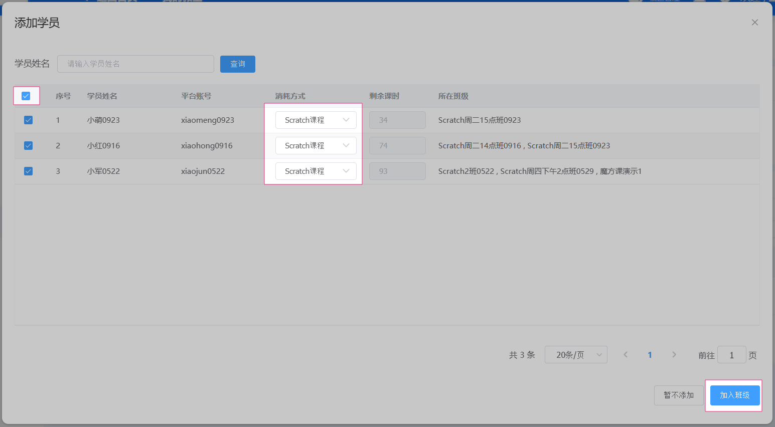 步骤3:这里展示的是购买了本班级关联的课程商品的学员
