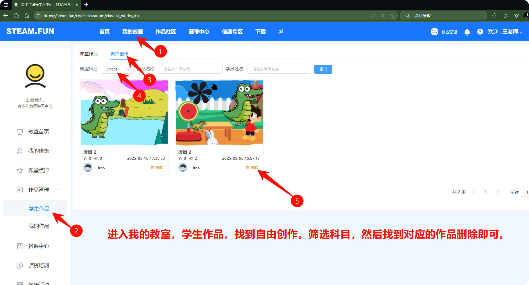 进入我的教室,学生作品,找到自由创作。筛选科目,然后找到对应的作品删除即可。