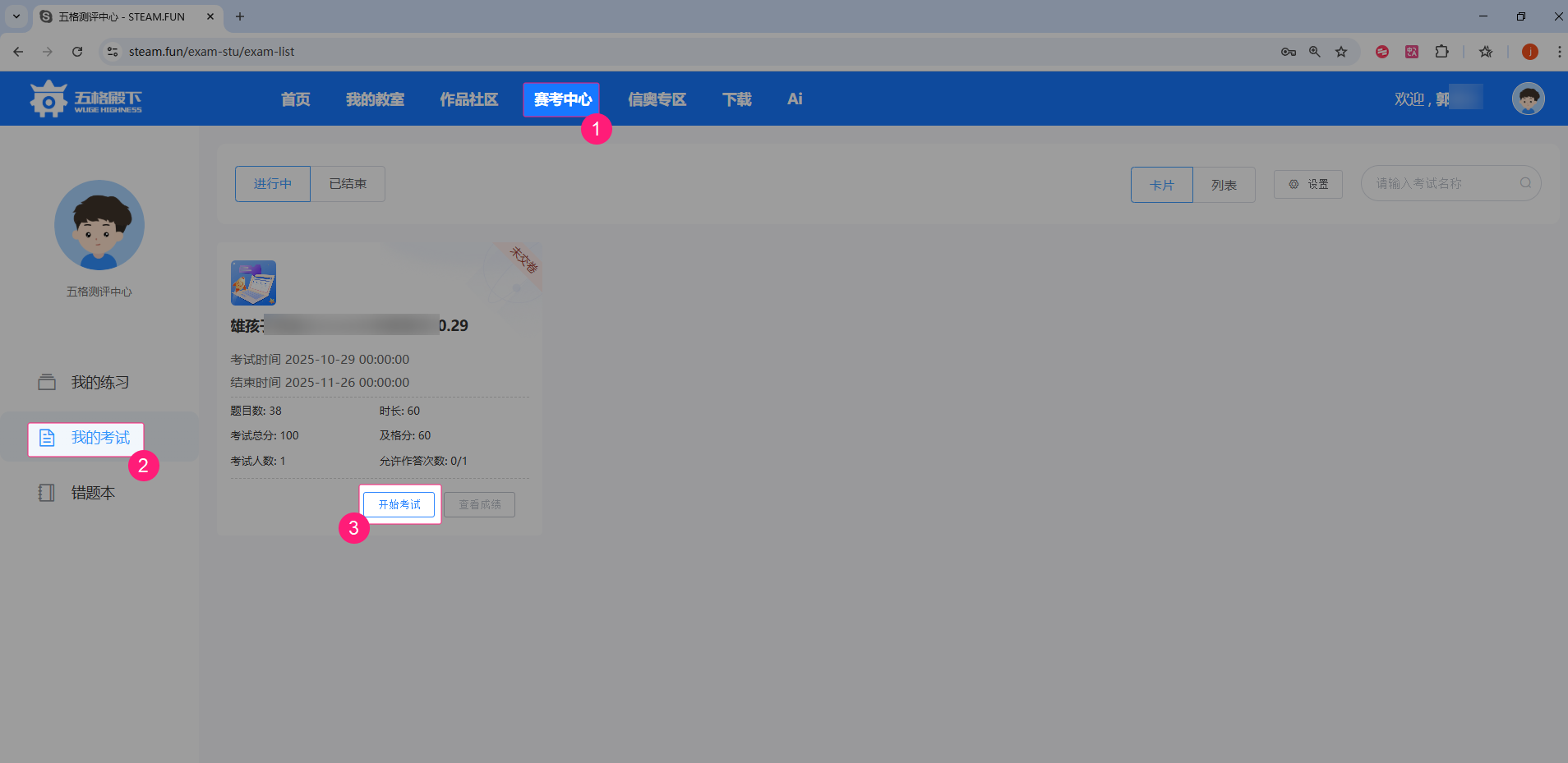 进入赛考中心-找到我的考试-找到对应的考试可以进入参加考试