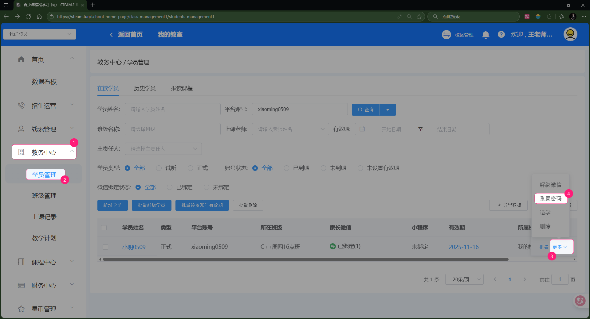 教务中心,学员管理,找到忘记密码的学员,点击更多,重置密码。