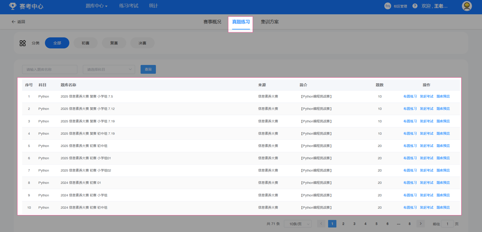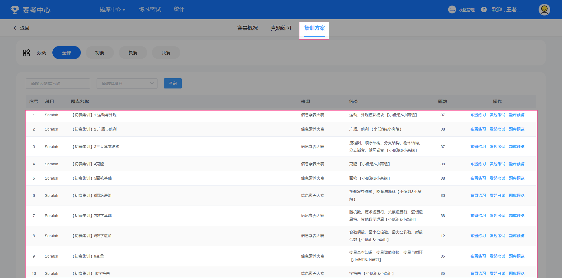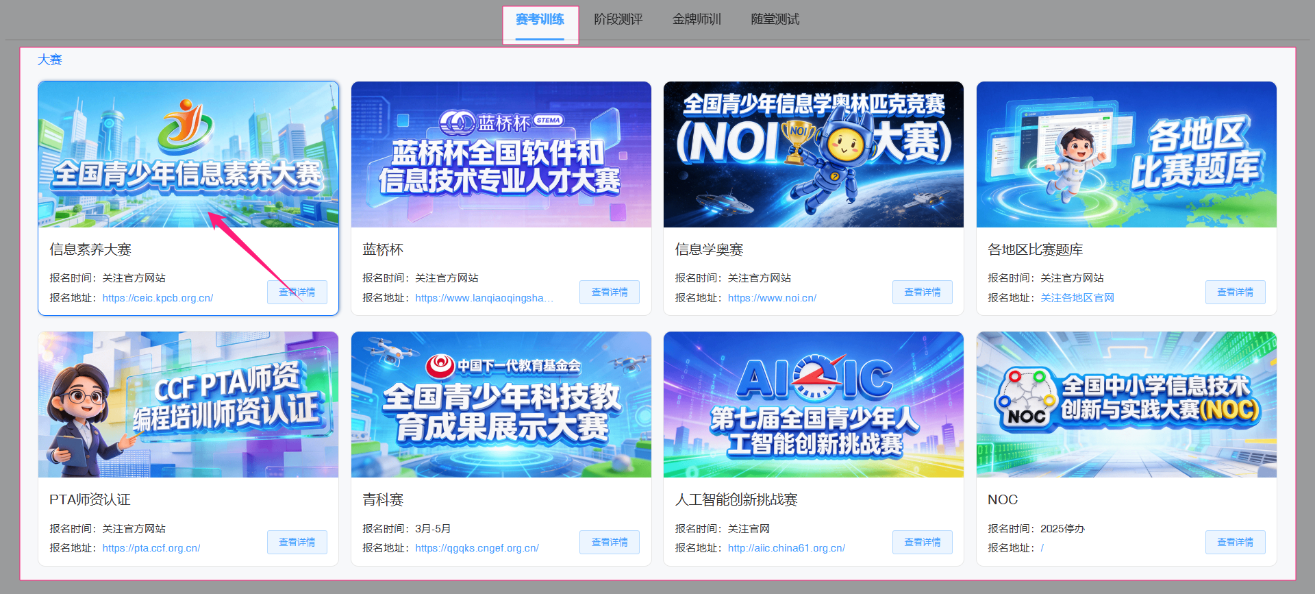 点选进入目标大赛版块,可以看到当前赛事集训方案相关试题