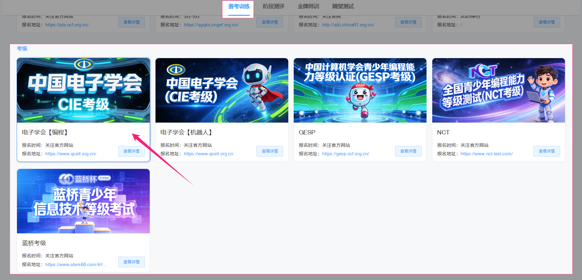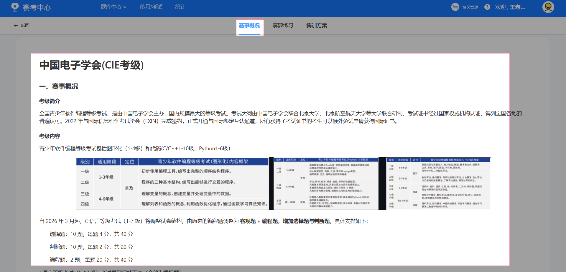 点选进入相关考级版块(此处以中国电子学会【编程】为例),可以查看此版块的赛事概况、真题练习及集训方案。