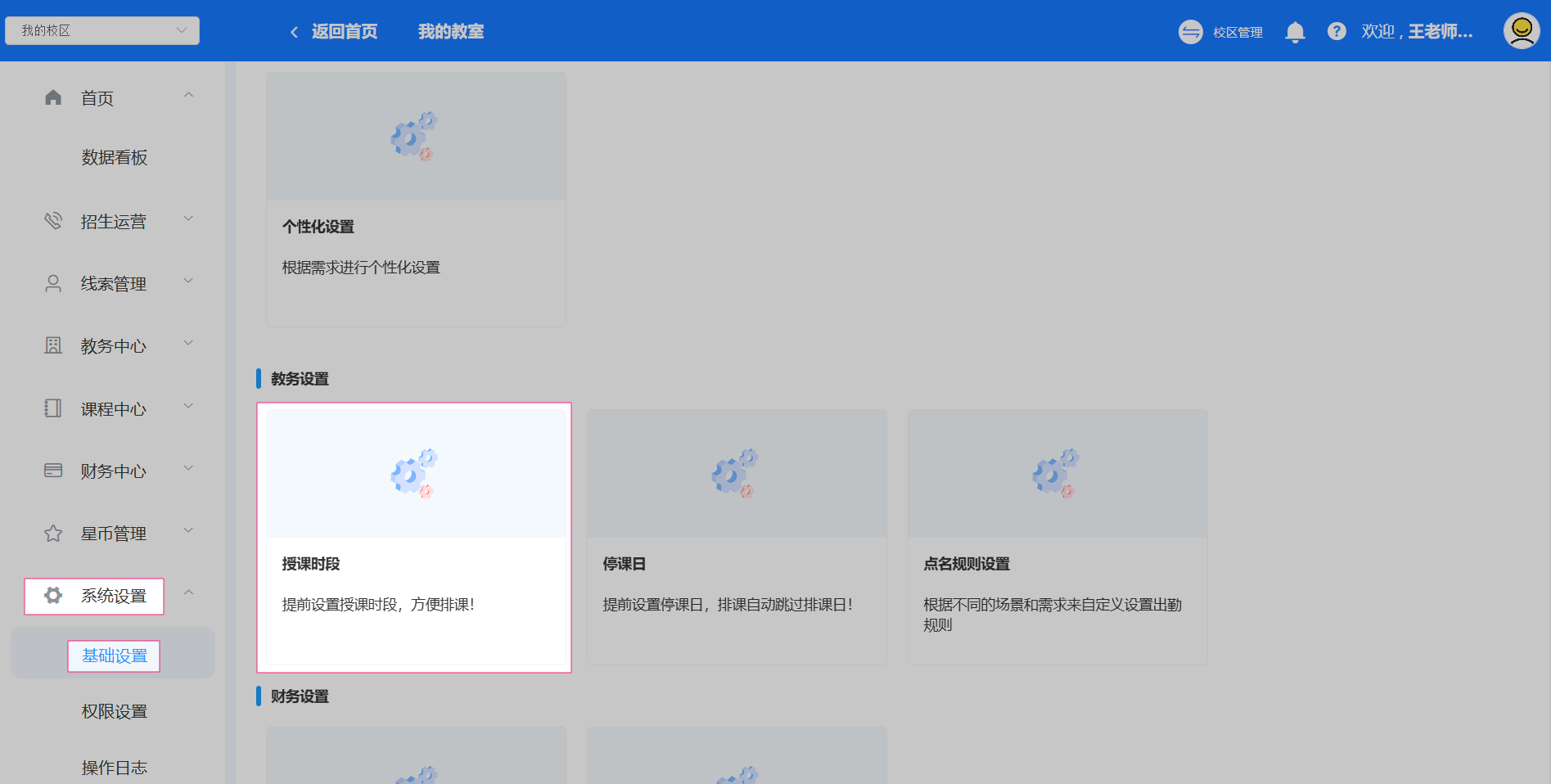 登录超管账号,点击校区管理,基础设置。找到教务设置中的授课时段(上课时段)。