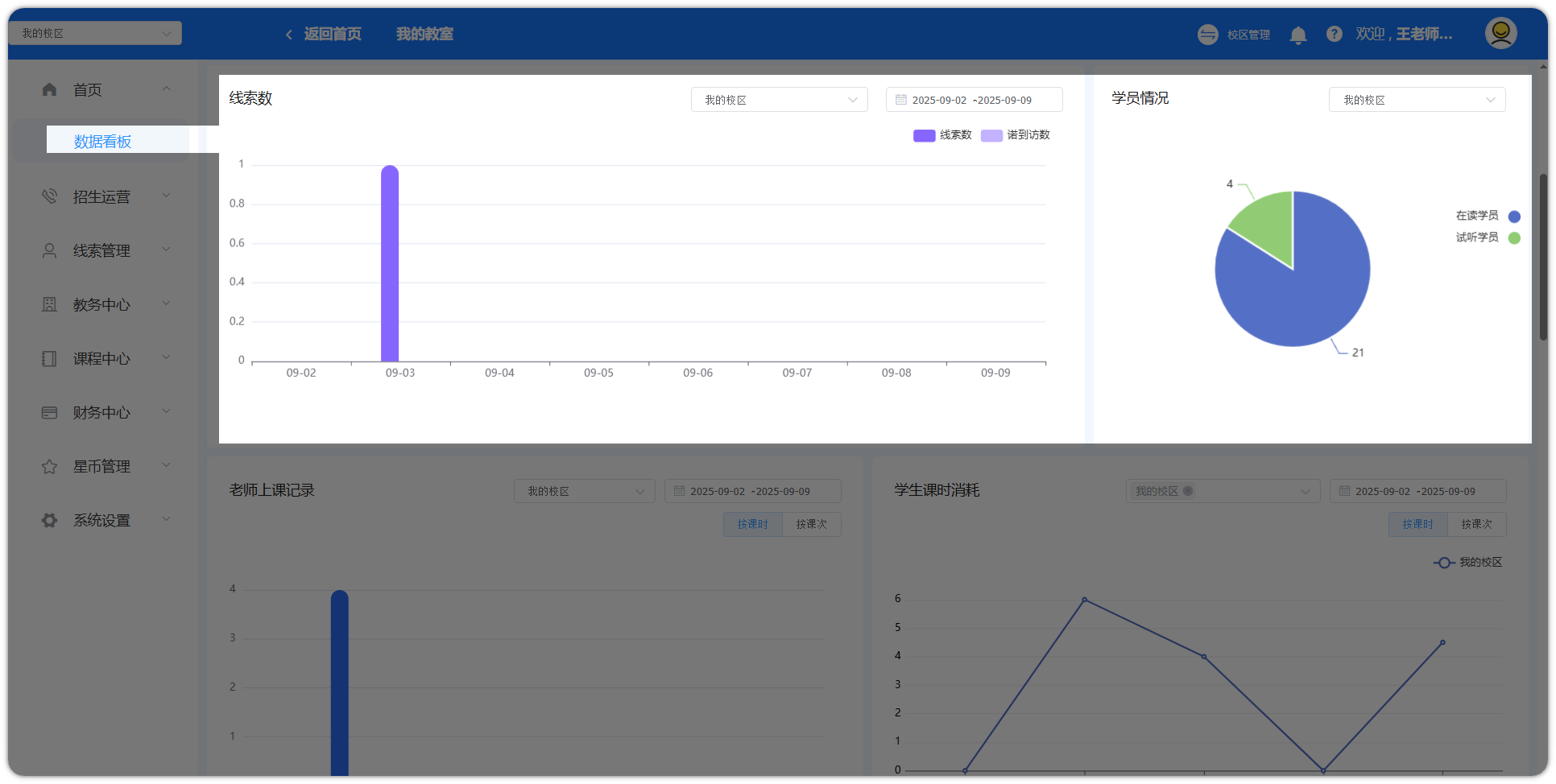 在此页面,可以看到校区的数据概览。如:总的线索数、总的在读学员的数量、总的老师上课记录、总的收益情况。
