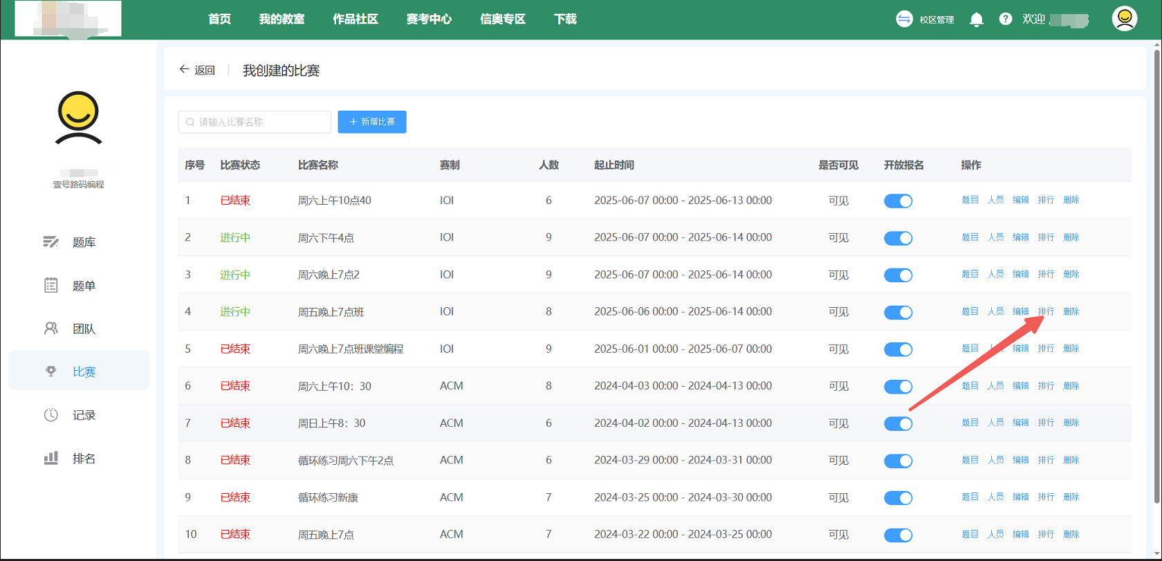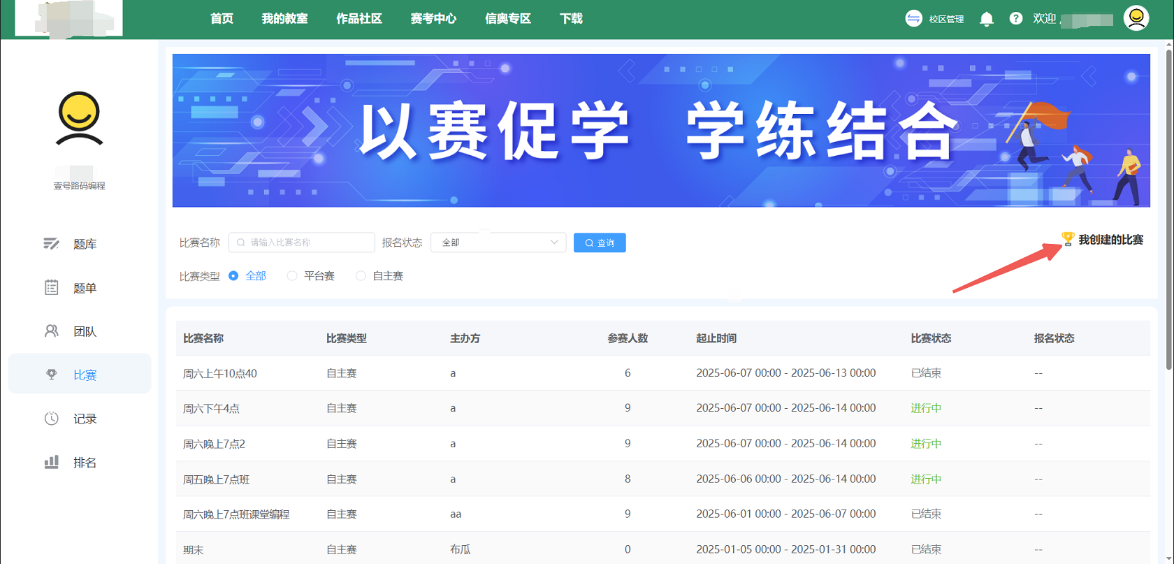 比赛界面是所有比赛列表,点击我创建的比赛,所有的数据都可以看。