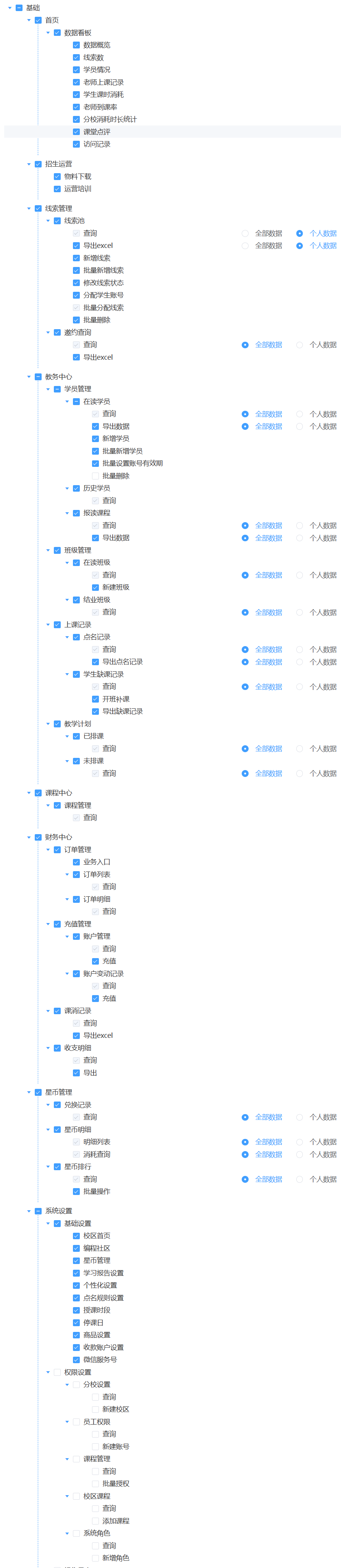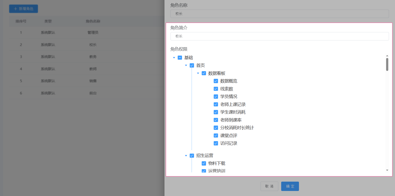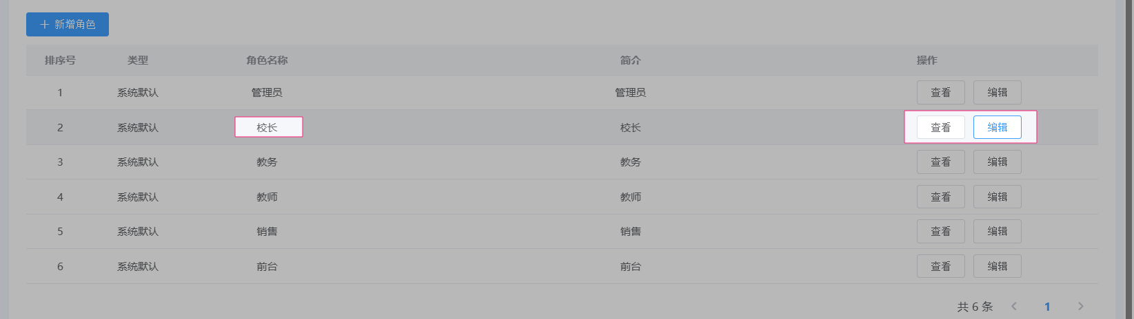 系统内置了6个角色,点击编辑按钮,可以查看/编辑权限详情。