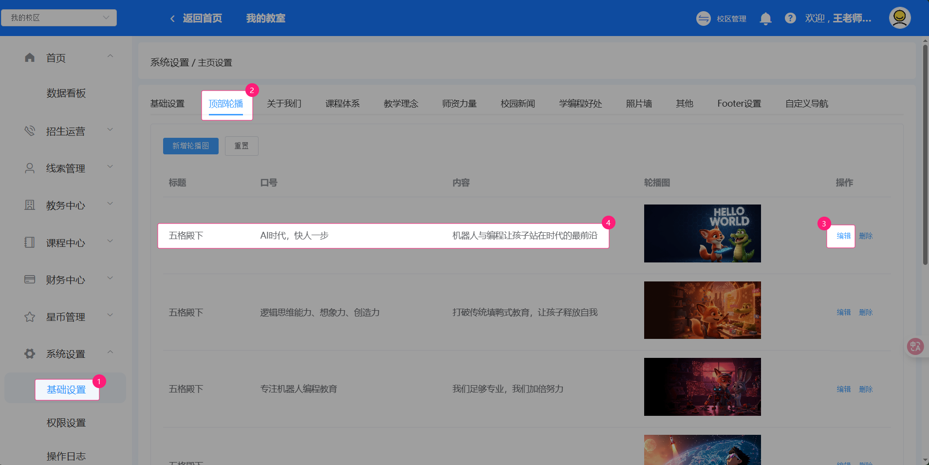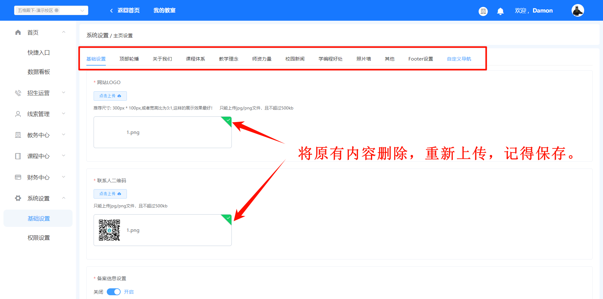 进入管理后台,在左侧菜单栏找到【系统设置】,选择【基础设置】【校区首页】;