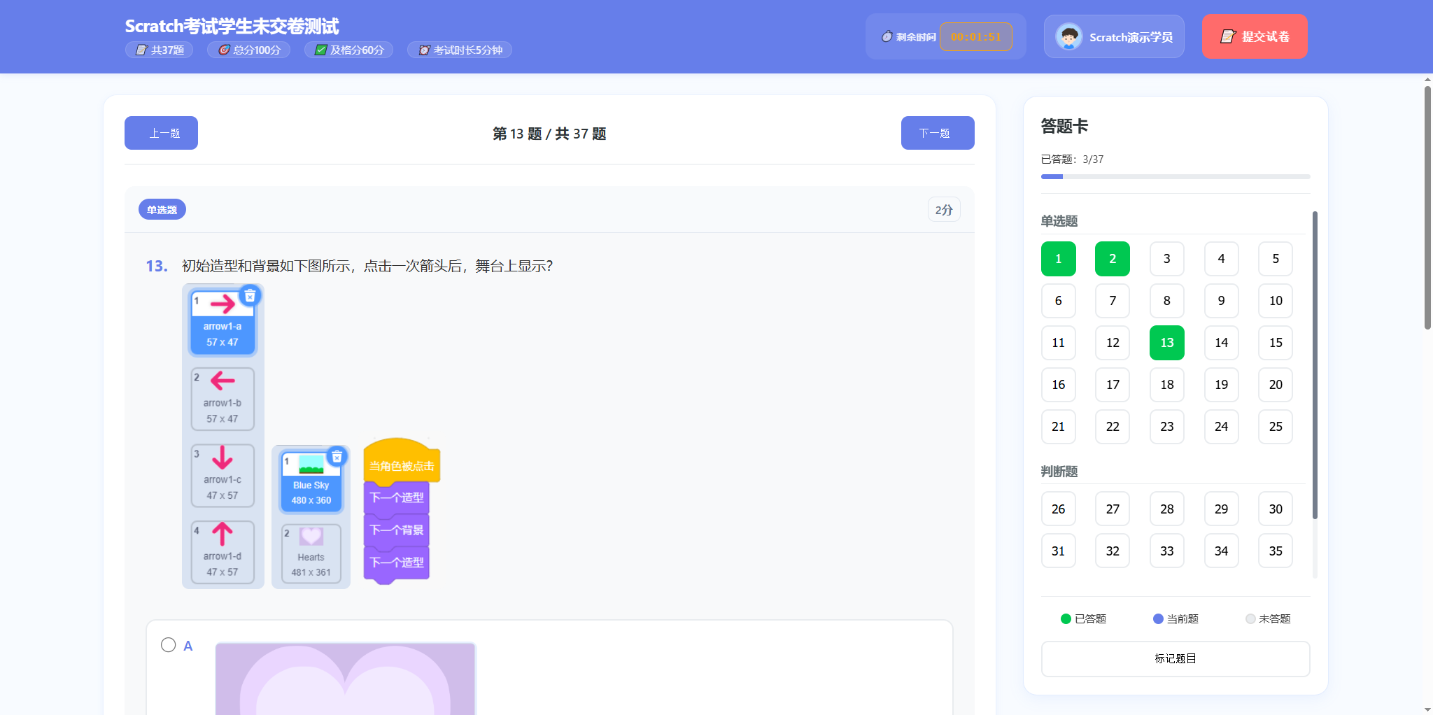 学生进行了作答,没有点提交试卷按钮。此时,学生的作答情况会自动存在系统内。 但是由于没有点提交试卷按钮,系统不会判分,所以状态为“未交卷”