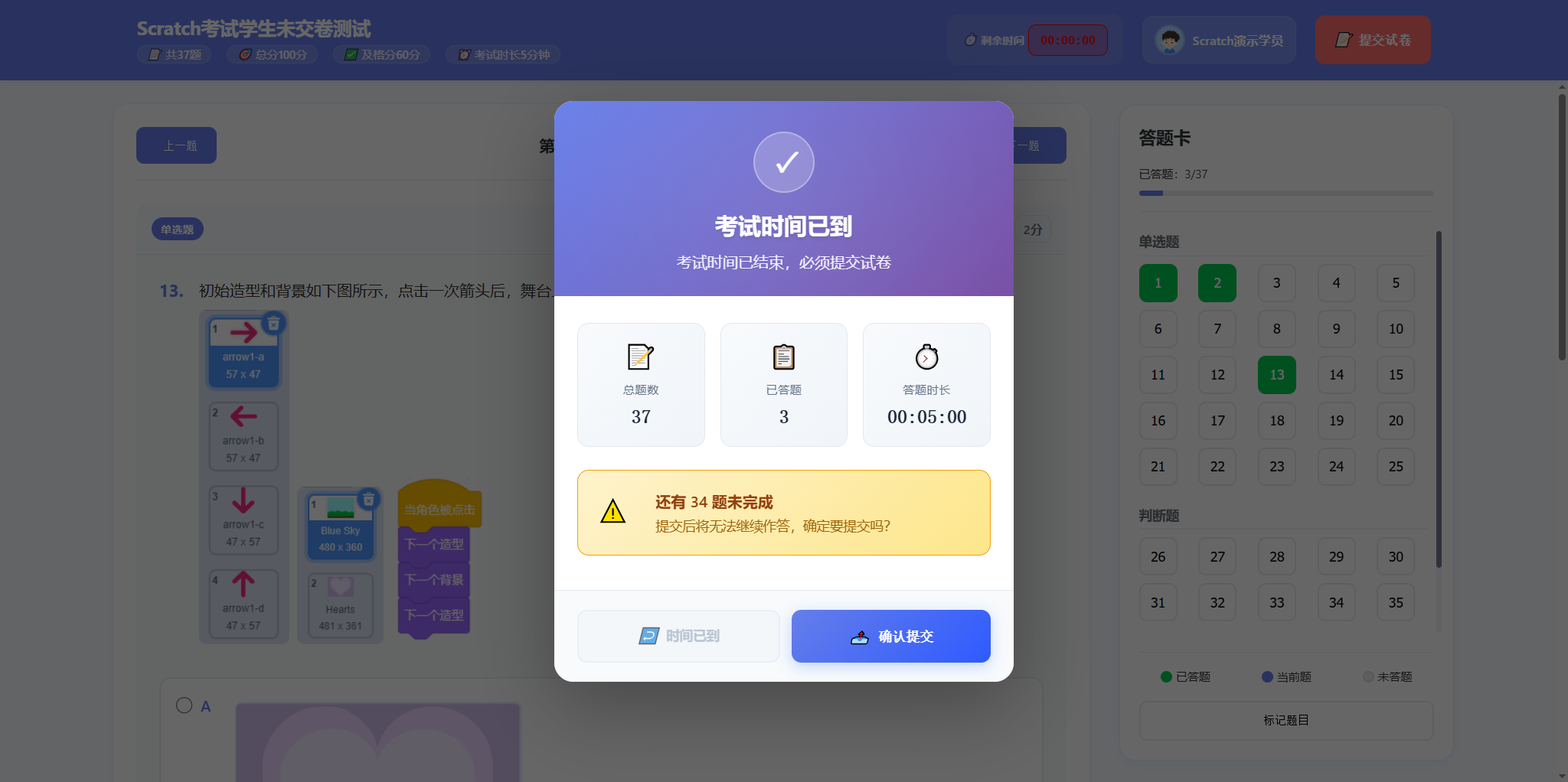 如果学生停留在此页面,但是考试时间到了,那么会提示必须要交卷。 此时点击 确认提交 按钮就可以。