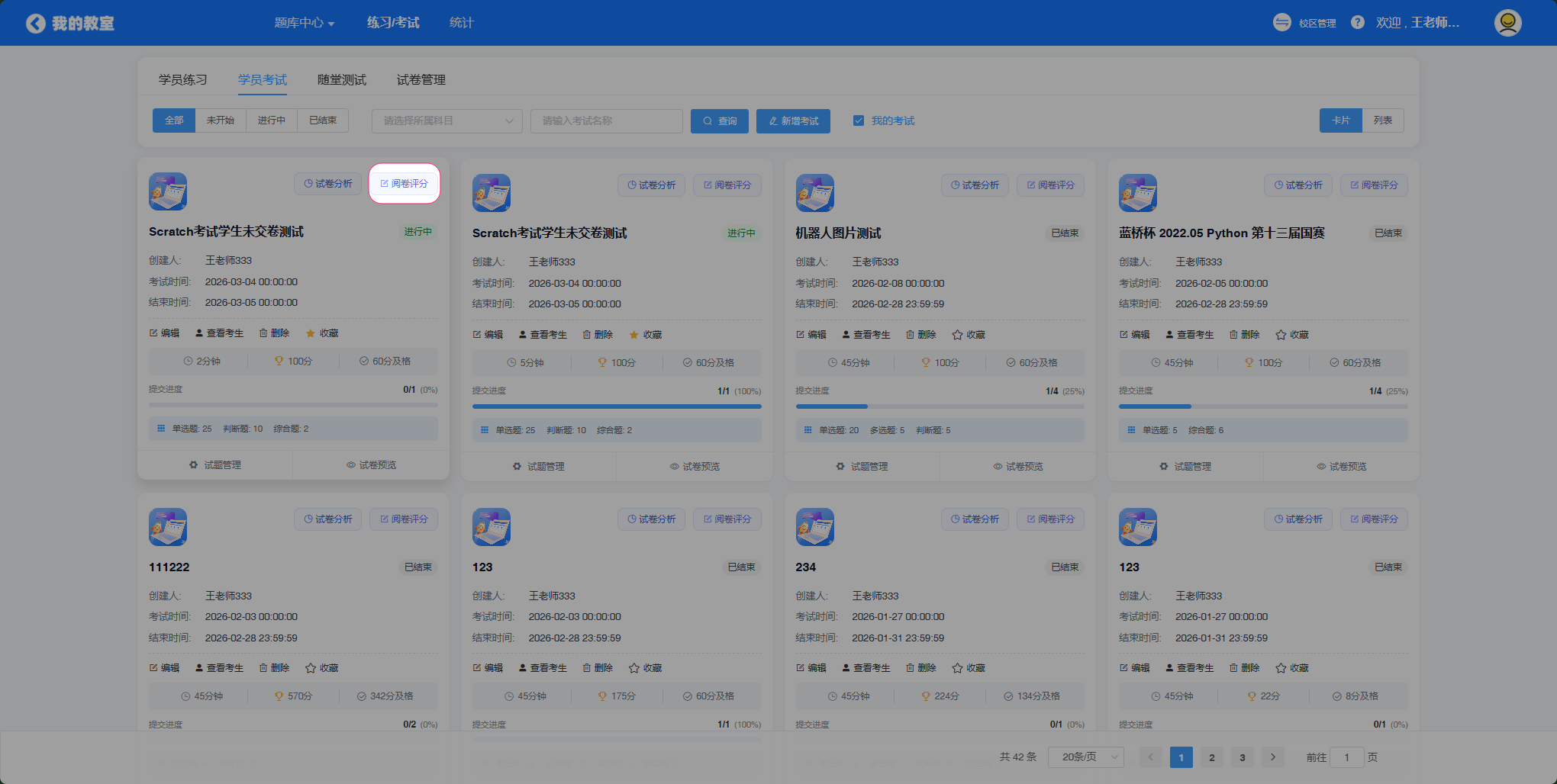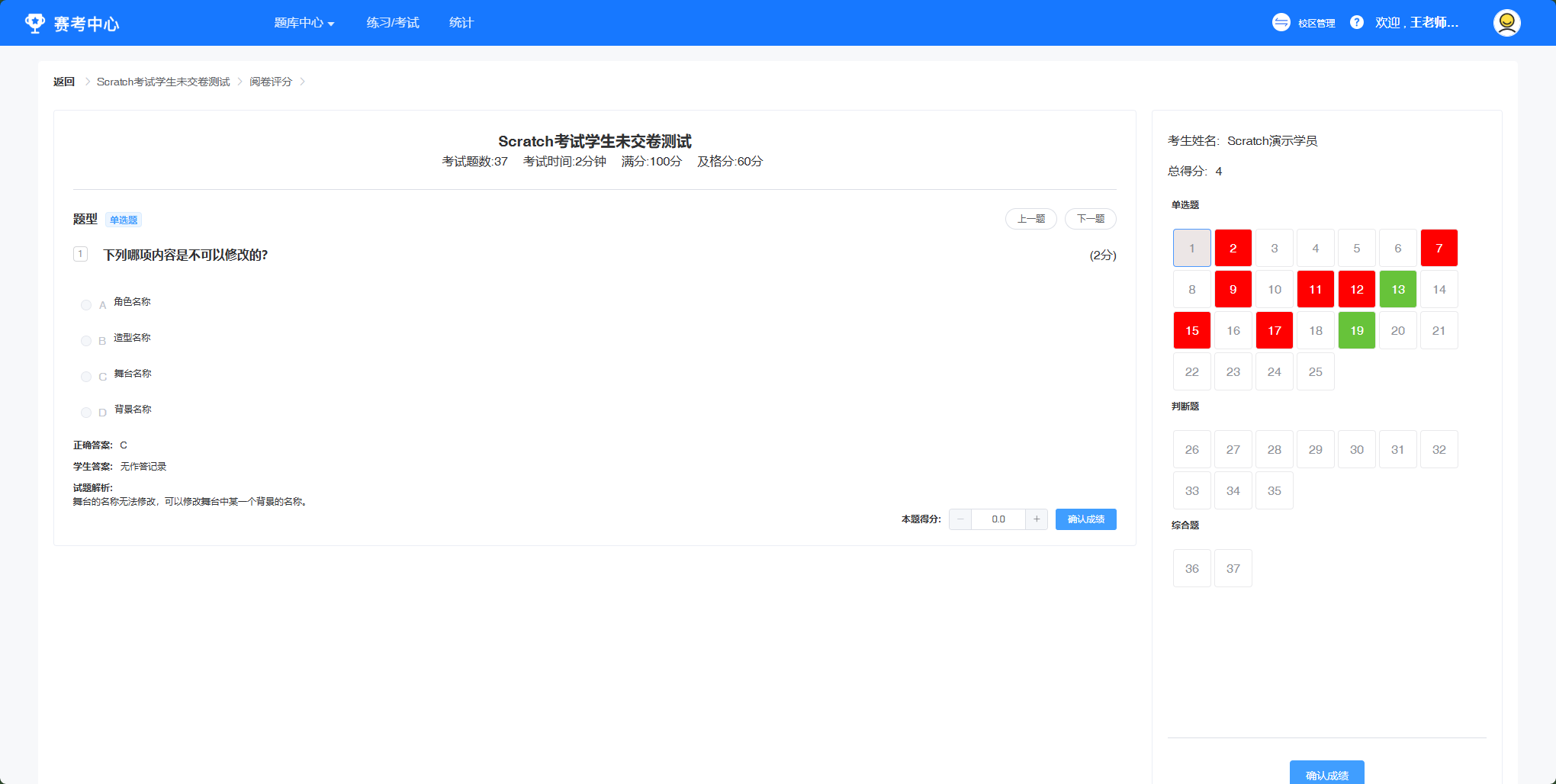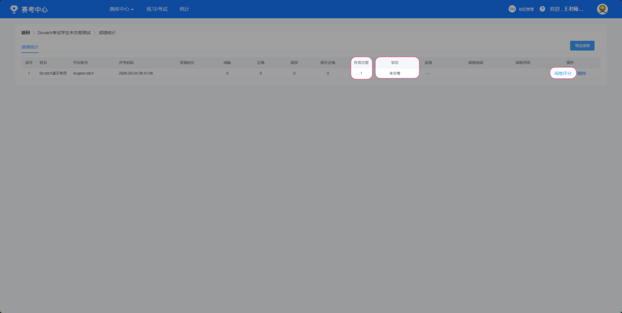 学生点击确认提交后,老师端会有考试结果。