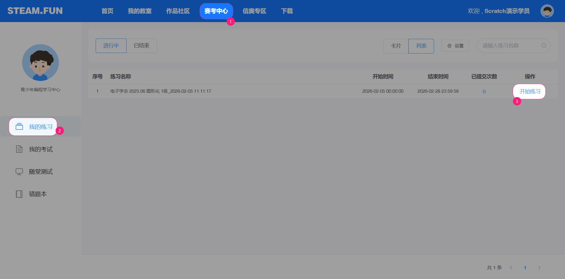 进入赛考中心,我的练习,可以找到老师下发的练习题。做完本次练习后,点击提交练习的按钮,可以完成1次练习。