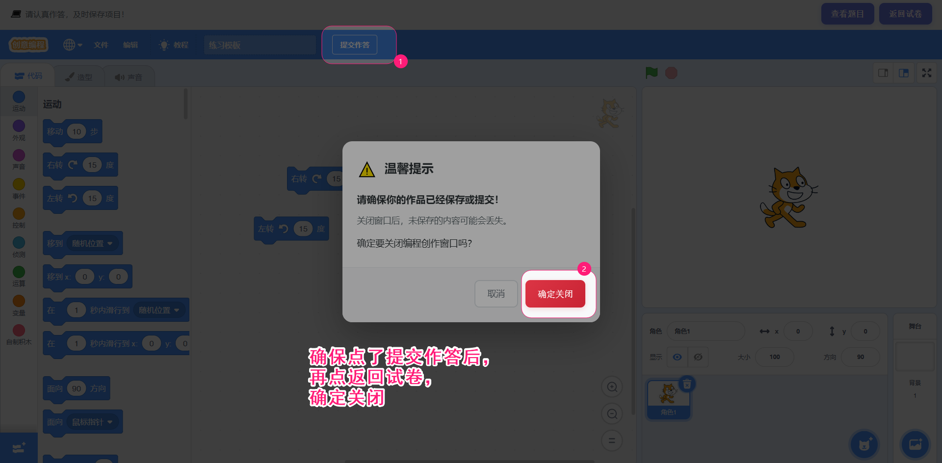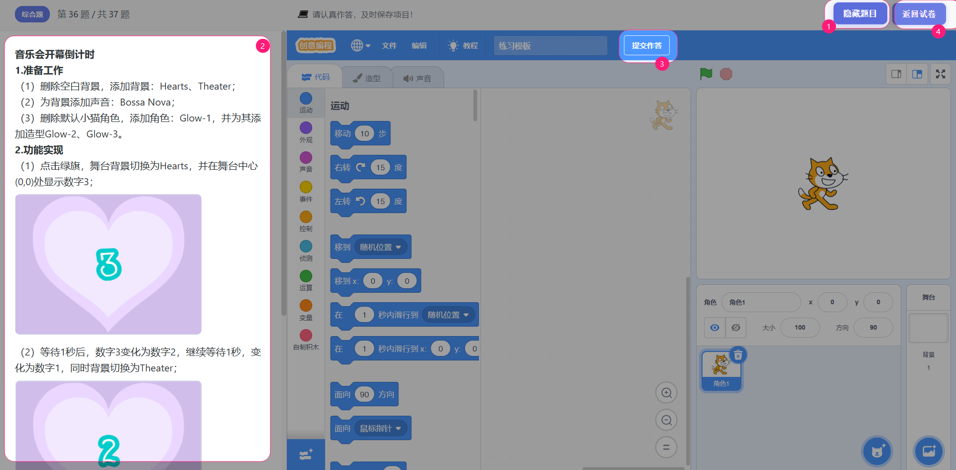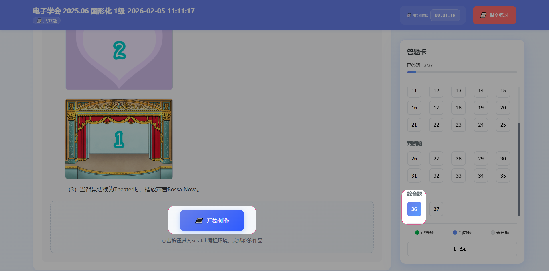 这里是综合题大题的页面 做大题时,可以查看题目,隐藏题目。 点【提交作答】按钮,可以将自己的作答程序提交。