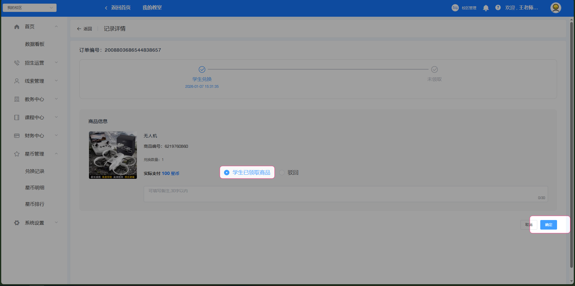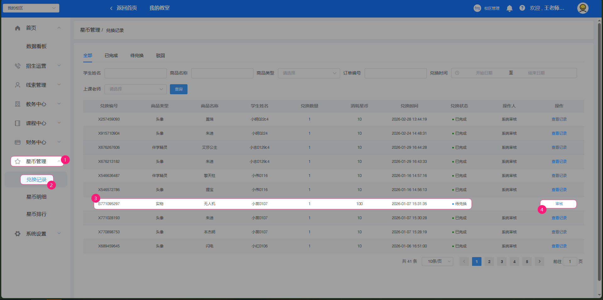 老师端,进入星币管理、兑换记录,找到学生提交过来的实物兑换申请。点击审核。