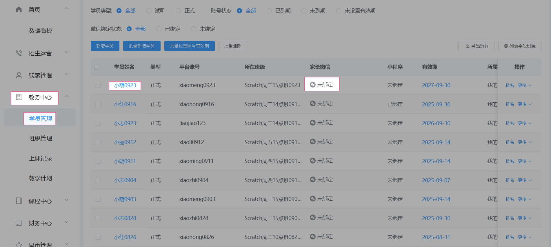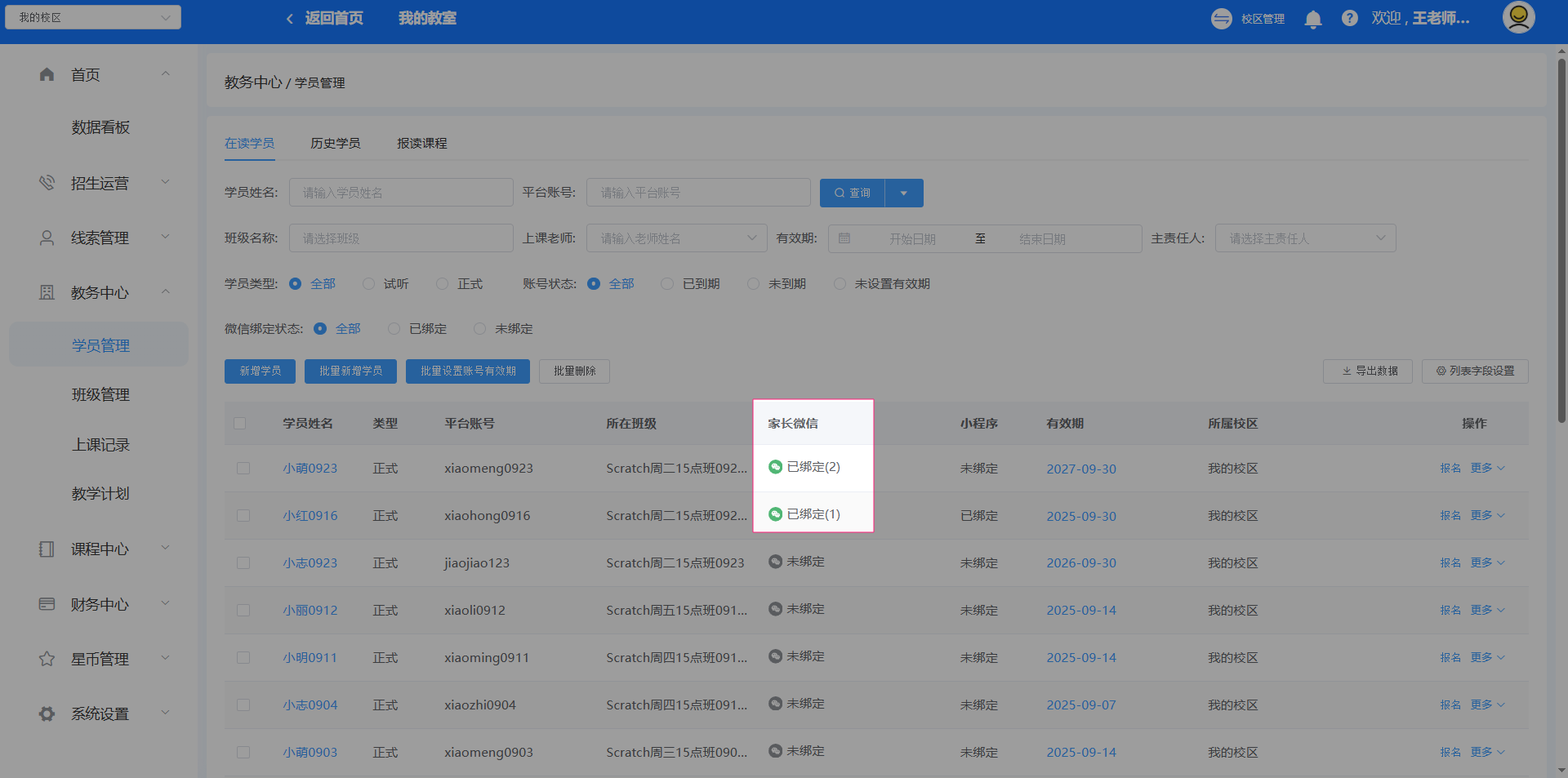 在教务中心-学员管理-学生账号后家长微信这一列显示已绑定,说明绑定成功。