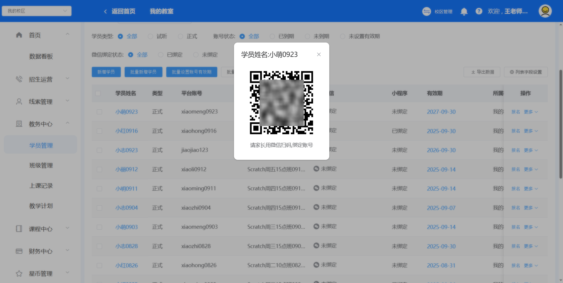 校区管理-教程中心-学员管理找到学员,点未绑定,可以生成专属二维码
