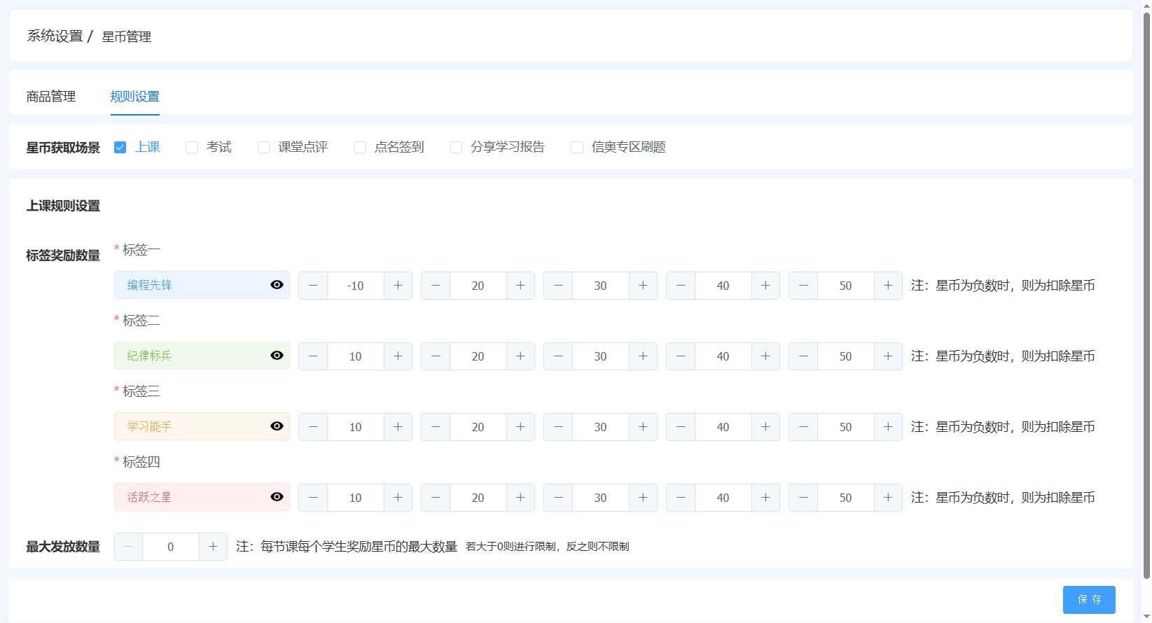 配置页:校区管理-系统设置-基础设置-星币管理-规则设置-上课场景