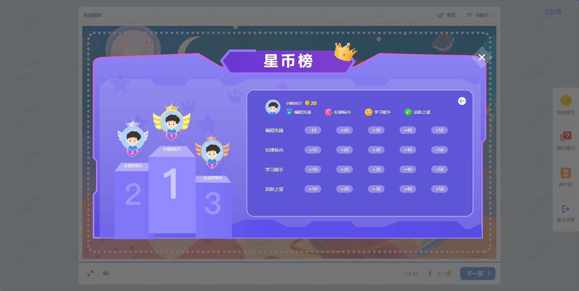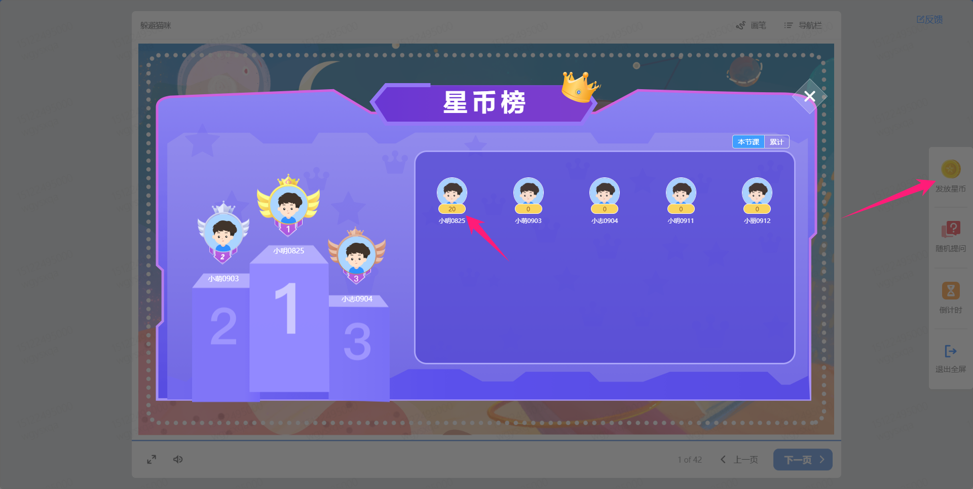应用页:我的教室-我的班级-进入目标班级-进入课堂-课件全屏-发放星币