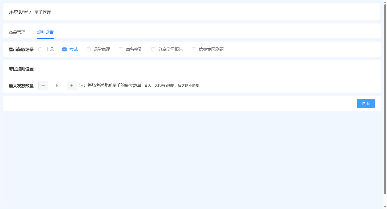 配置页:校区管理-系统设置-基础设置-星币管理-规则设置-考试场景