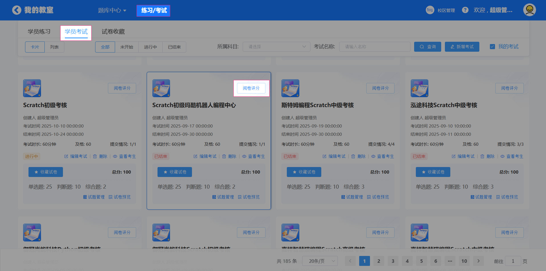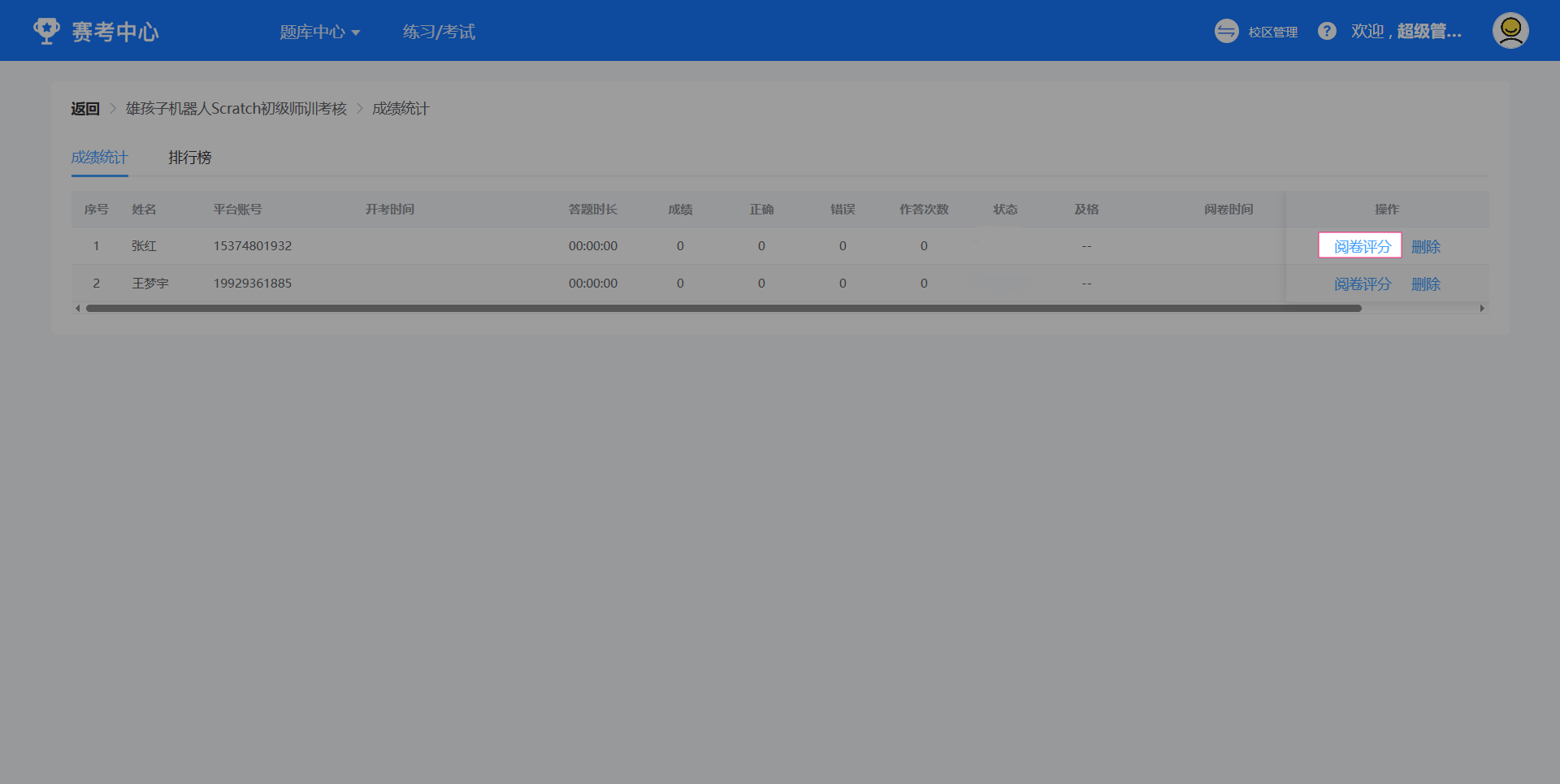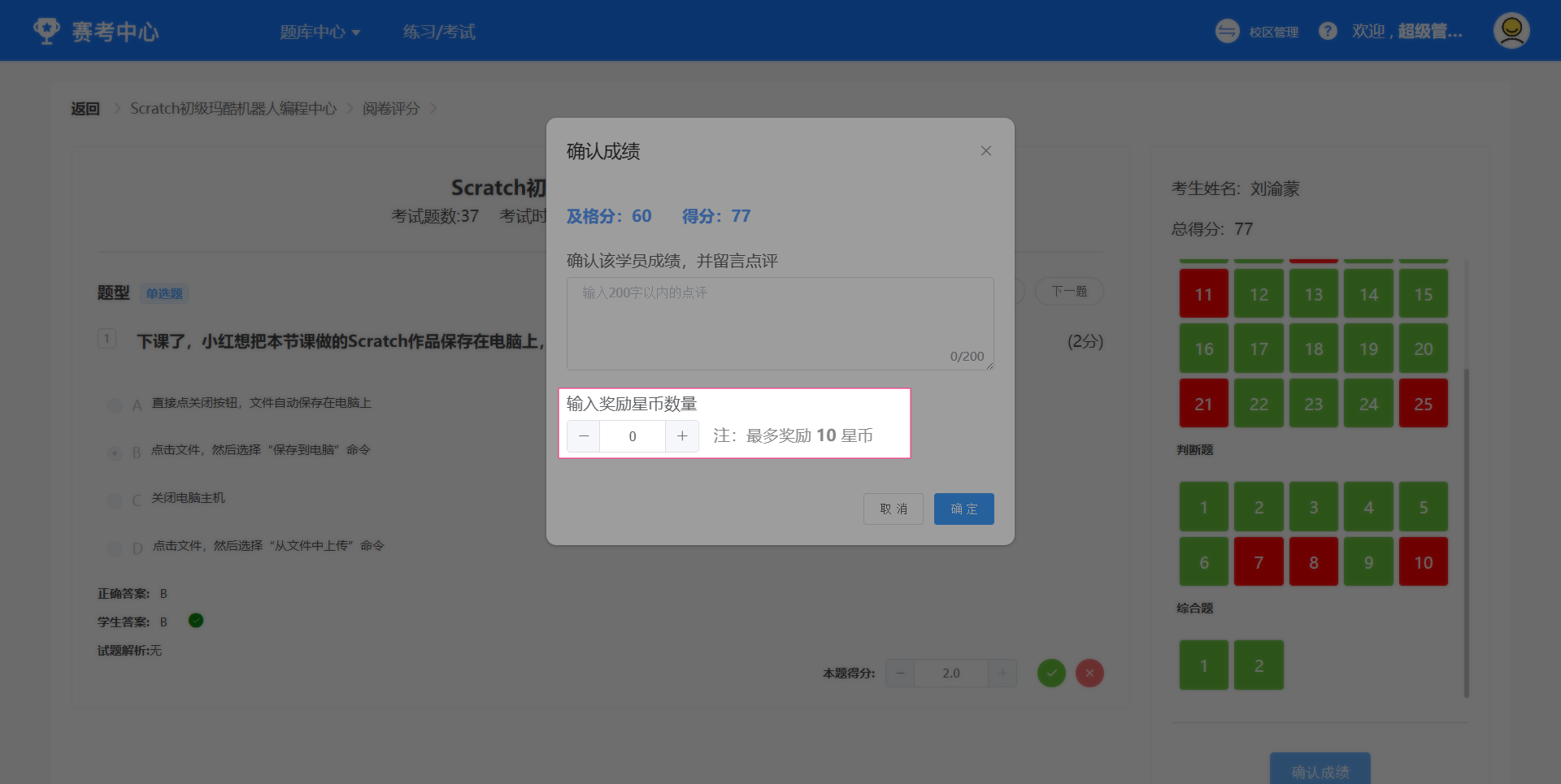 应用页:赛考中心-练习/考试-学员考试-阅卷评分-阅卷评分-奖励星币