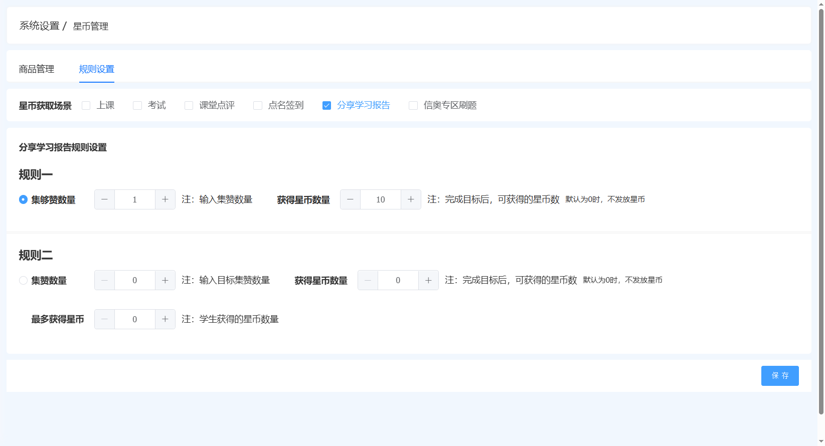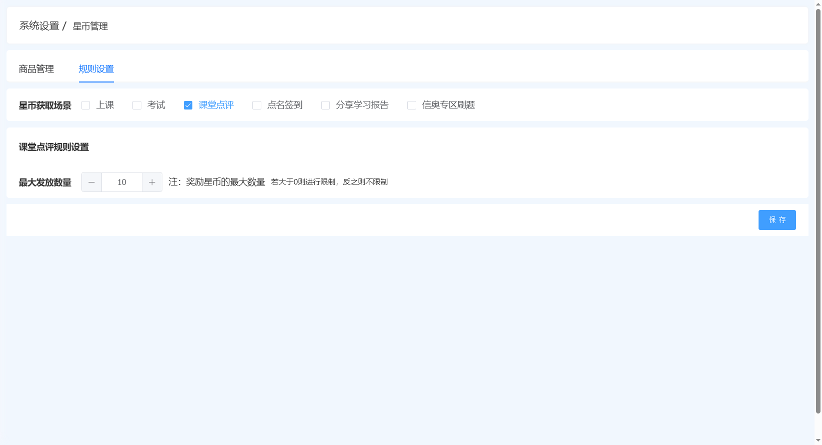 配置页:校区管理-系统设置-基础设置-星币管理-规则设置-课堂点评