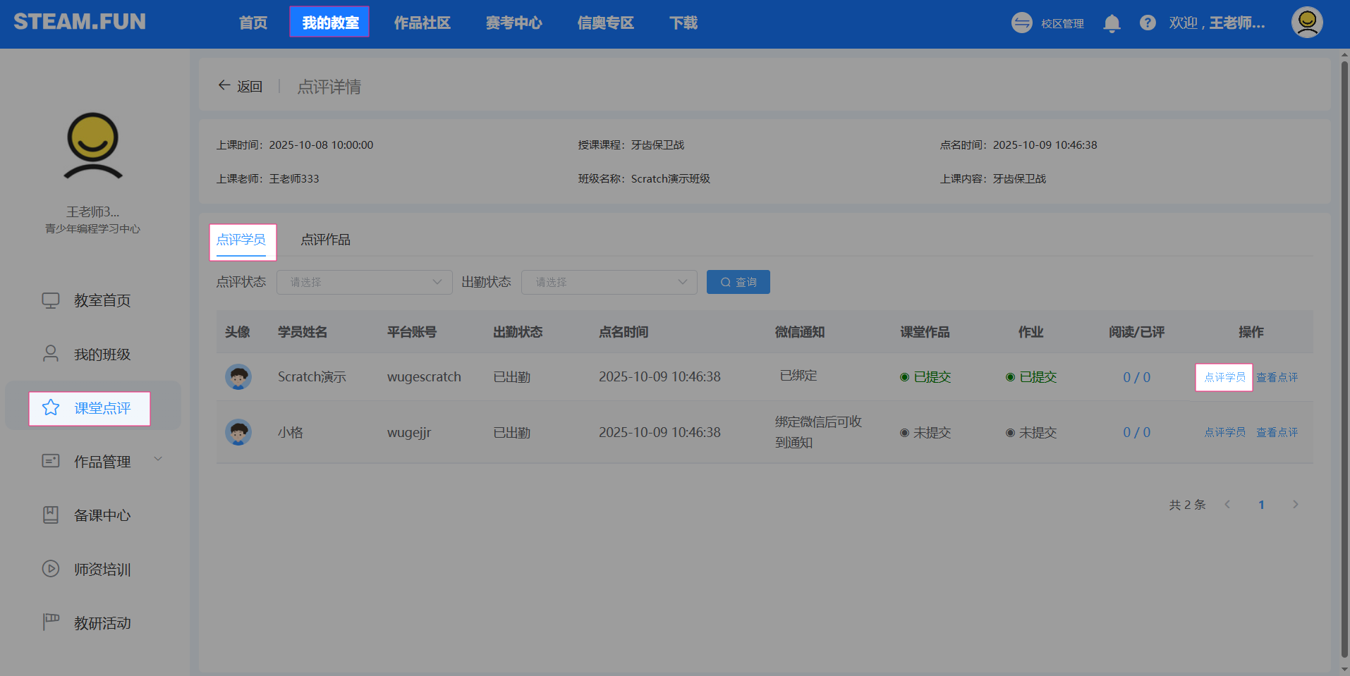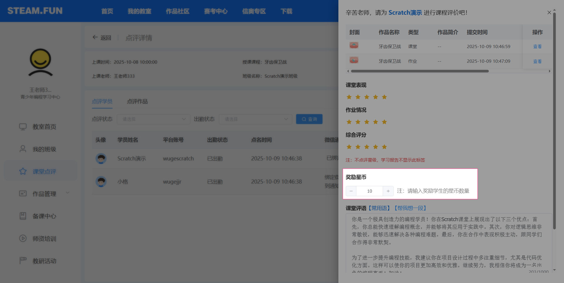 应用页:我的教室-课堂点评-找到目标班级-去点评-点评学员-奖励星币