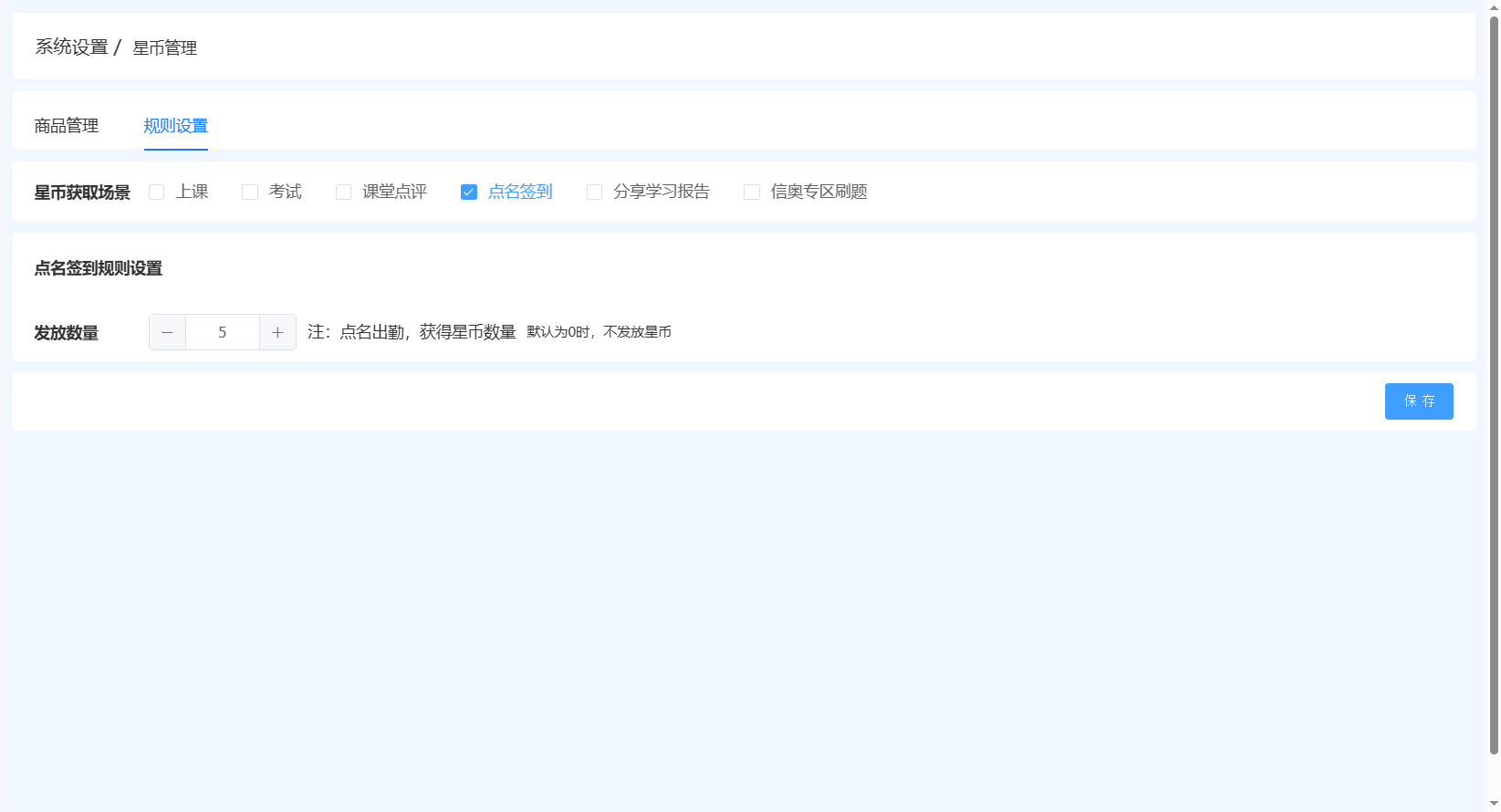 配置页:校区管理-系统设置-基础设置-星币管理-规则设置-点名签到