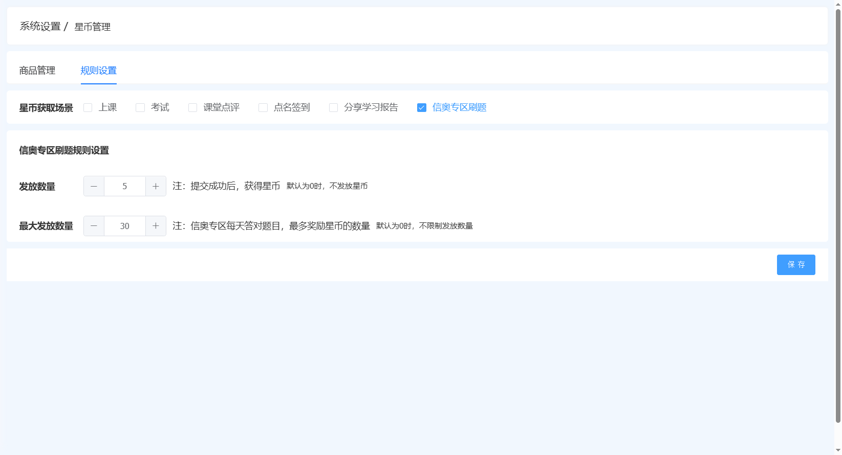 配置页:校区管理-系统设置-基础设置-星币管理-规则设置-信奥专区刷题