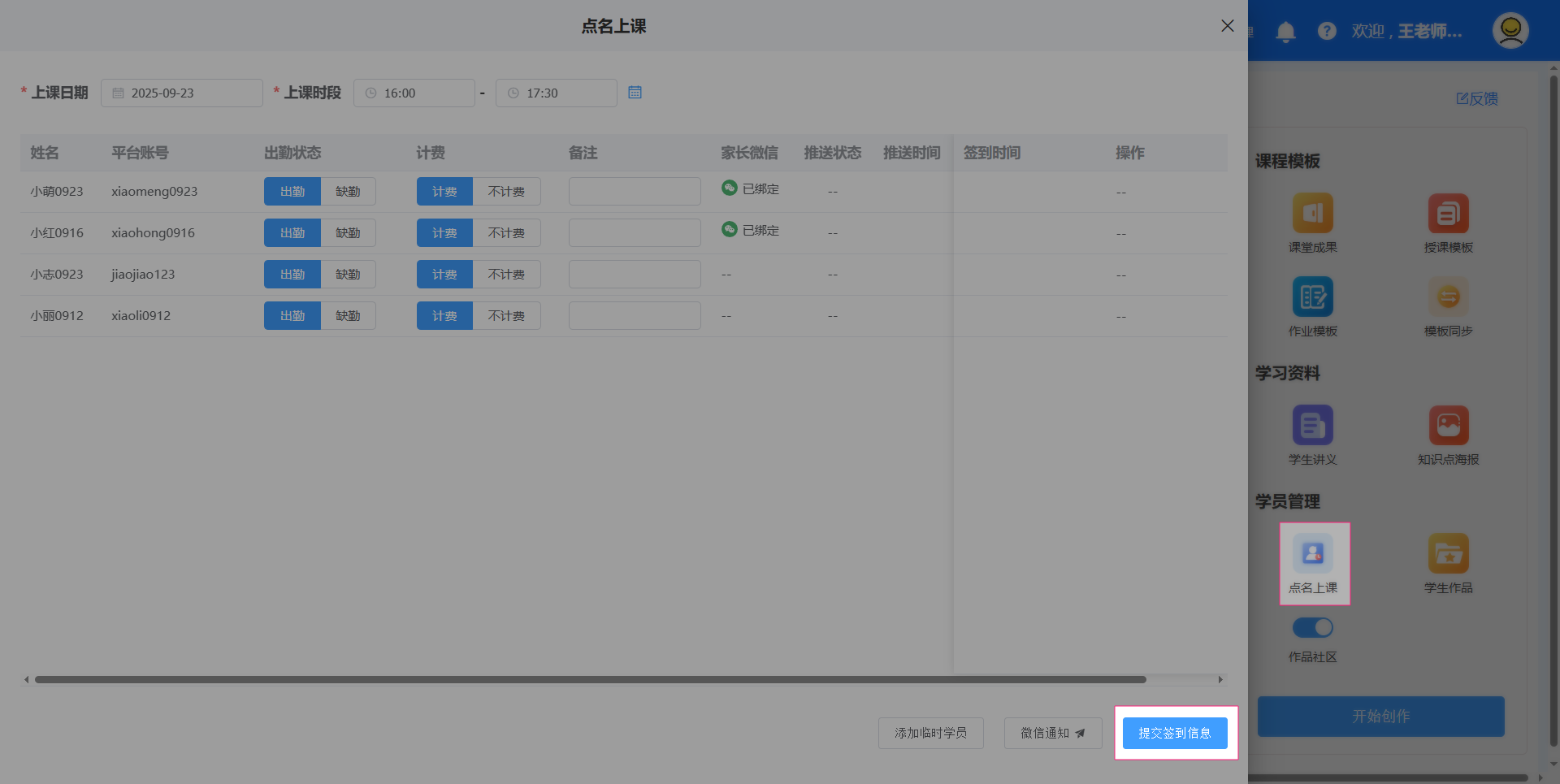 提交签到信息时,系统会自动发放星币给出勤的学员。