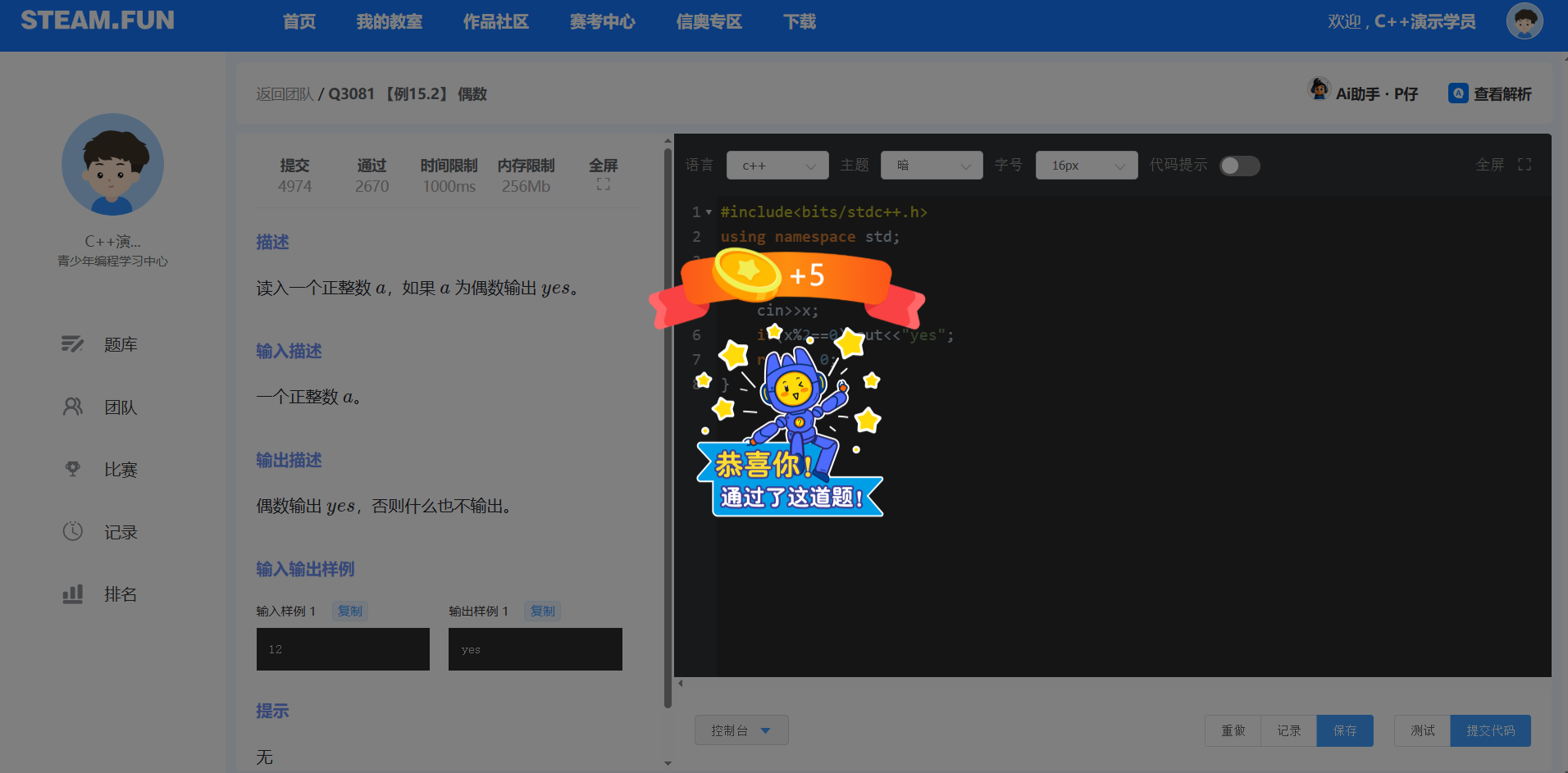 应用页:信奥专区-团队-进入目标团队-团队题单-查看目标题单-查看目标题目-提交代码
