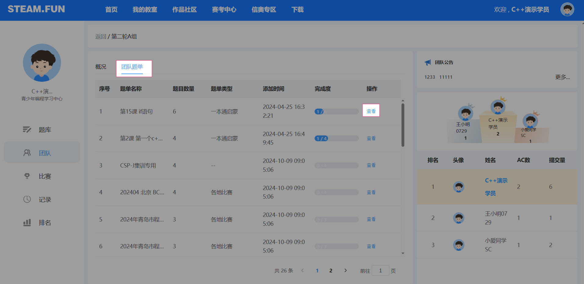 信奥专区中的比赛,老师如何看到学生的排名