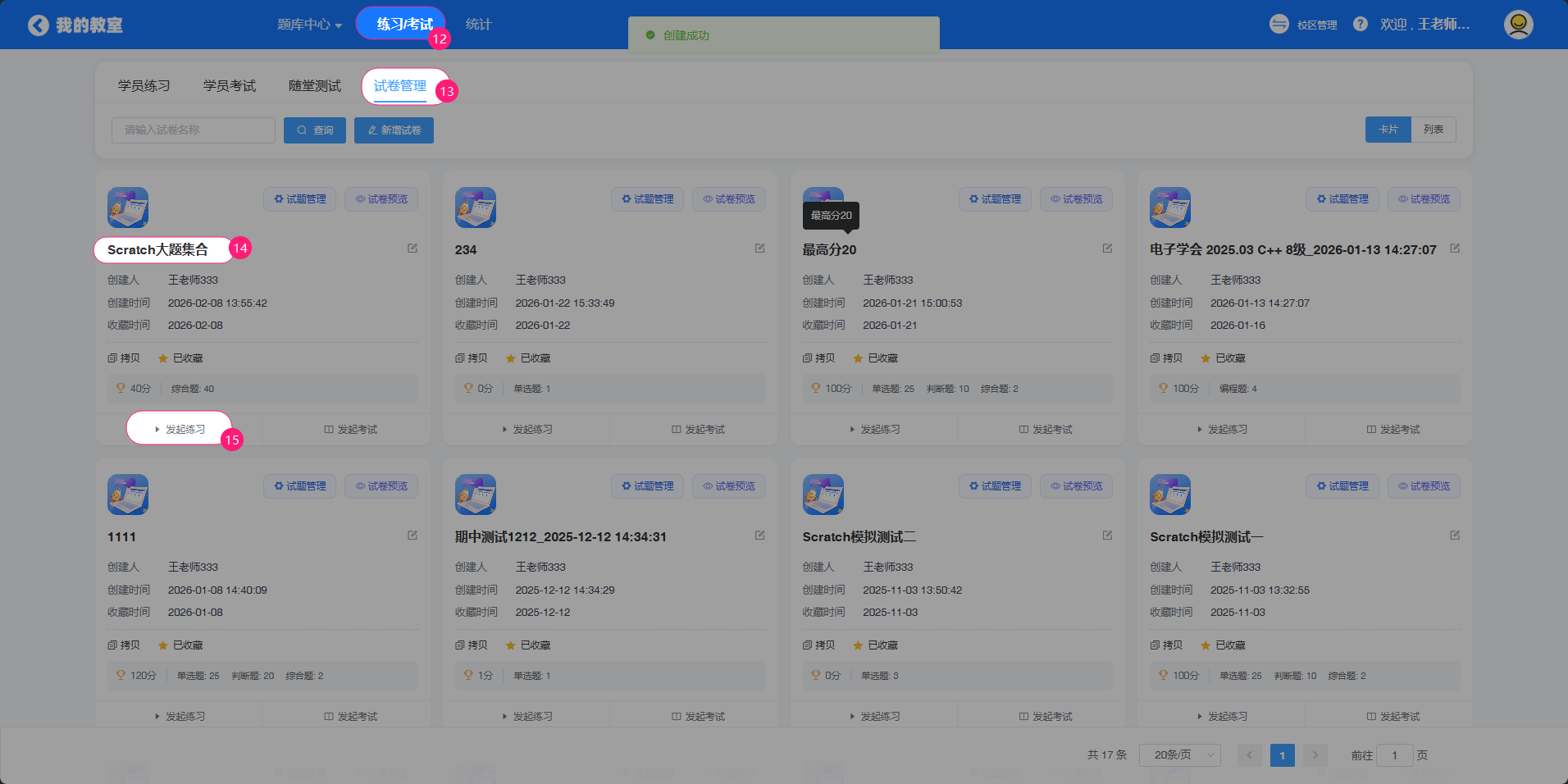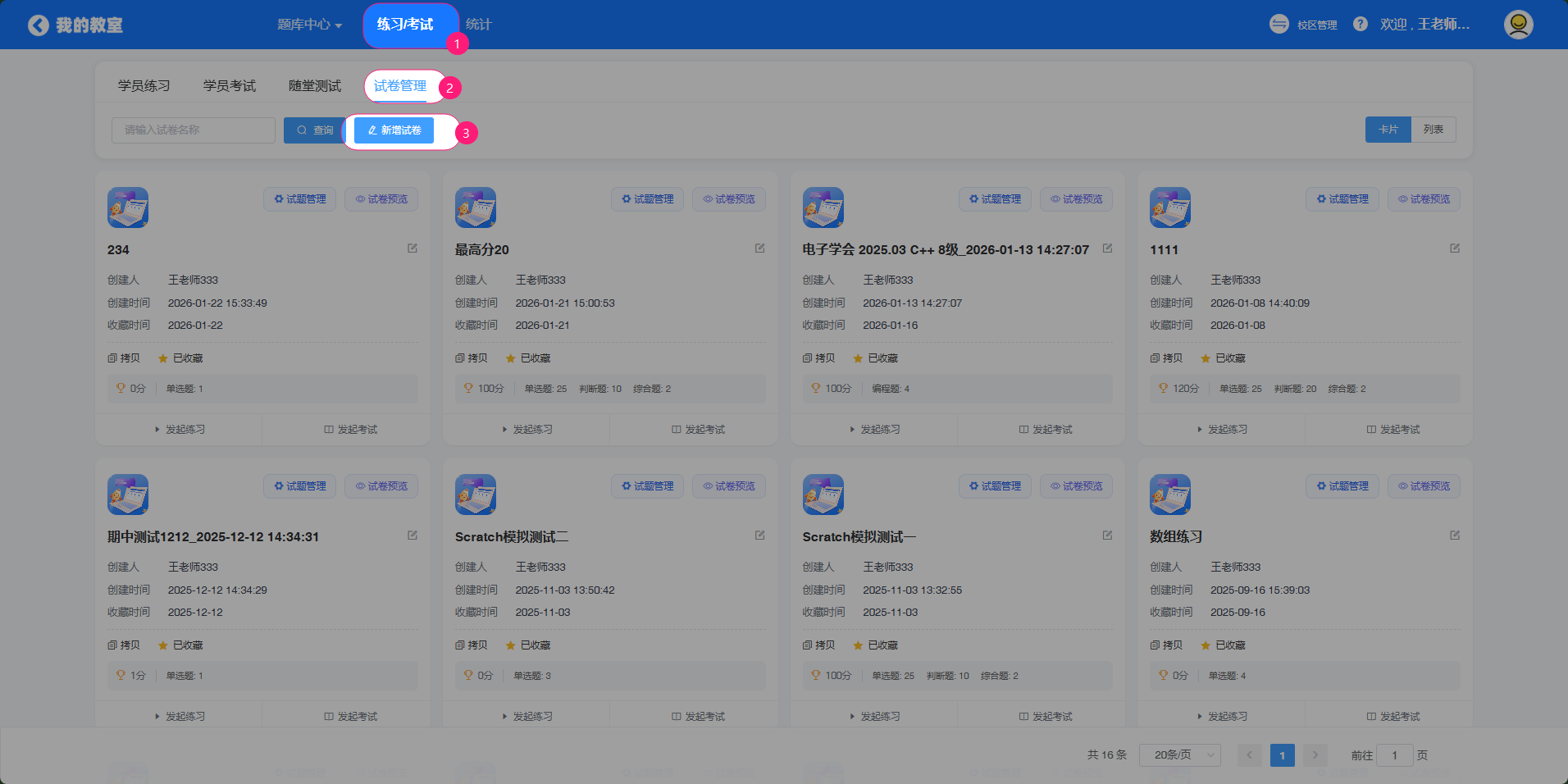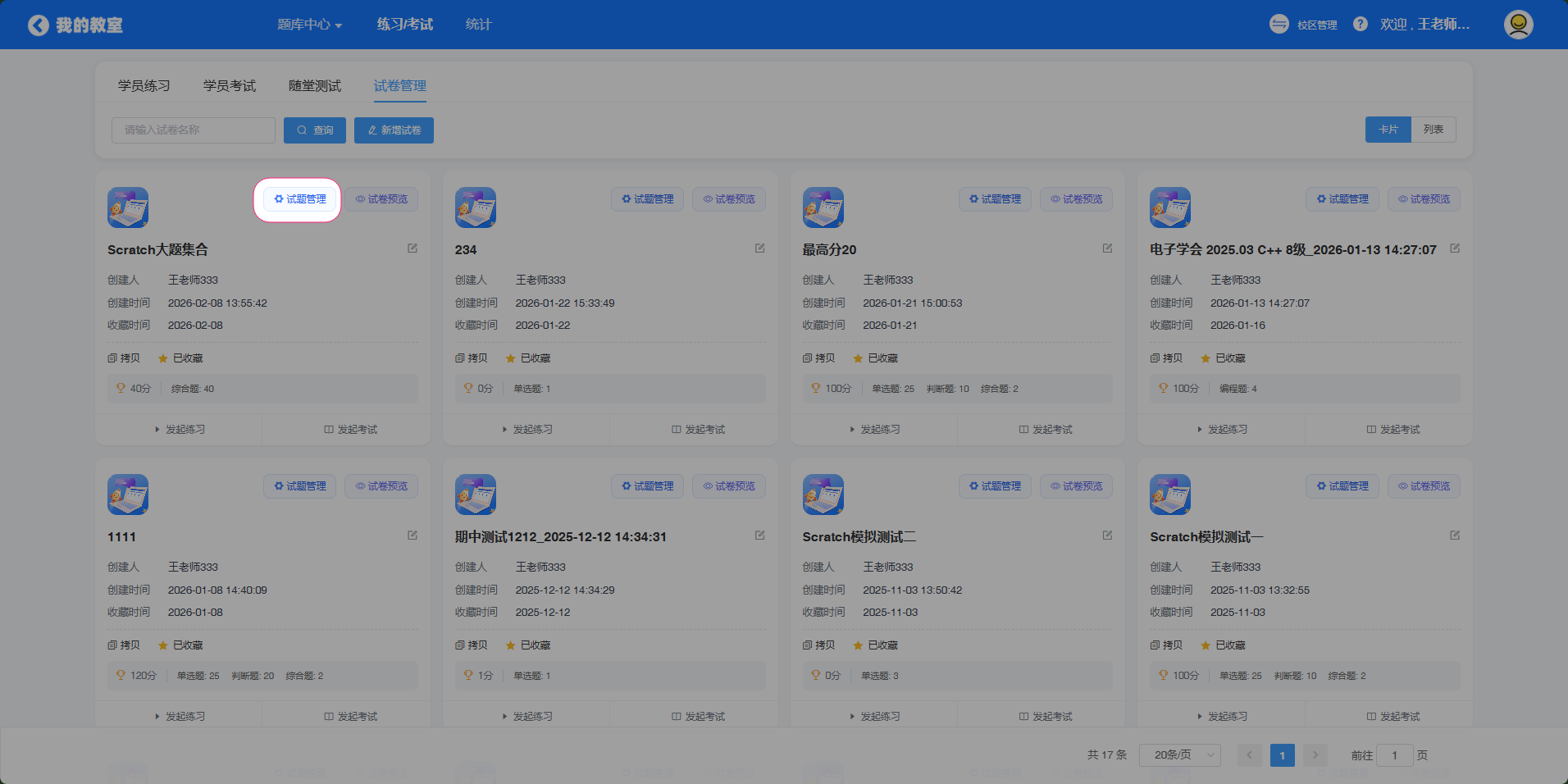 老师们可以将系统内的题自由组建为自己的试卷,然后再下发给学员进行考试或练习。也可以随时在已经组好的试卷中增加额外的题目让学生进行考试或练习。