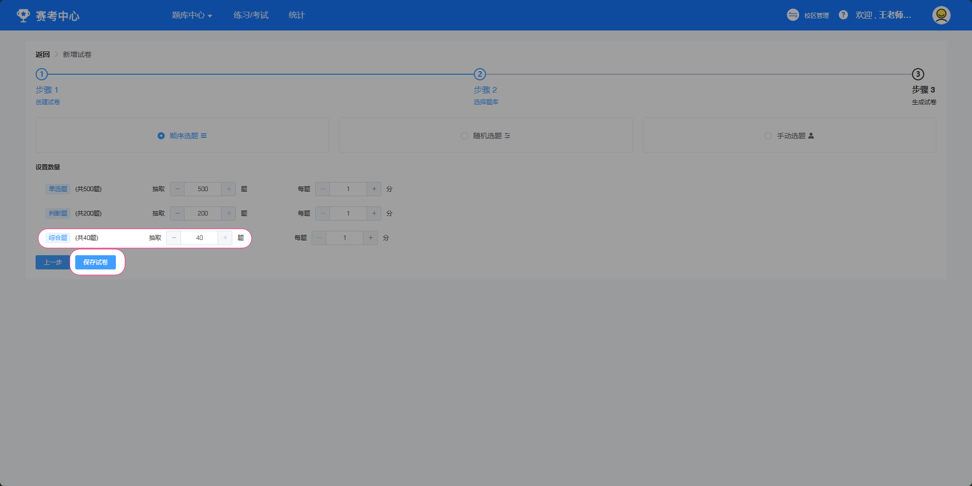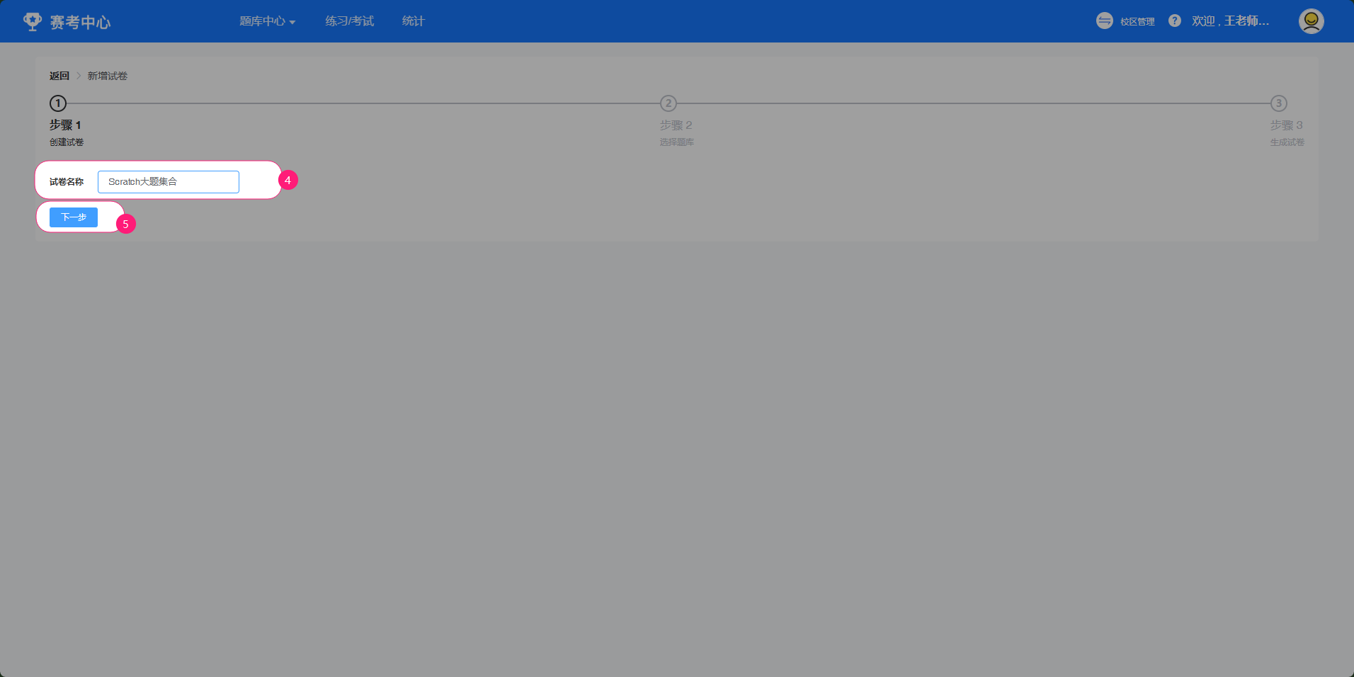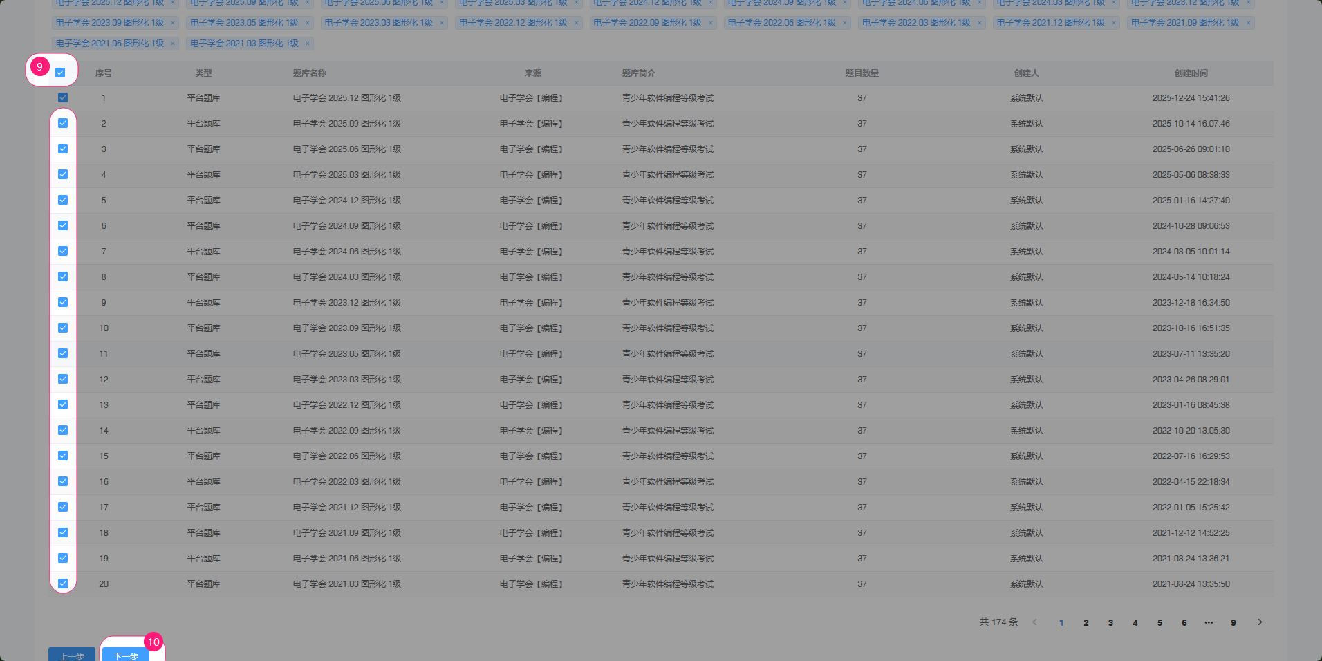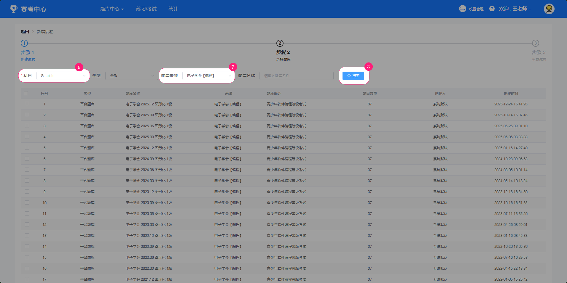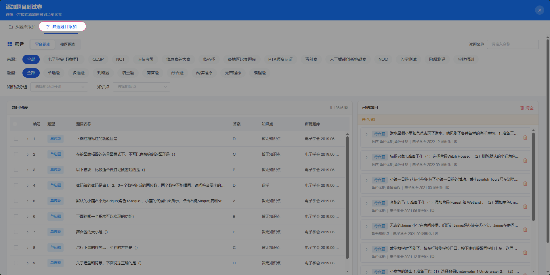 接下来模拟场景:如何将电子学会Scratch编程题集中组卷 具体操作步骤如下: